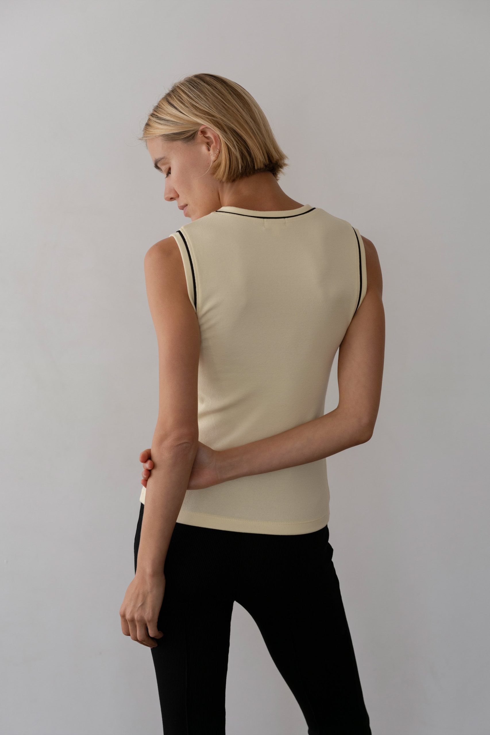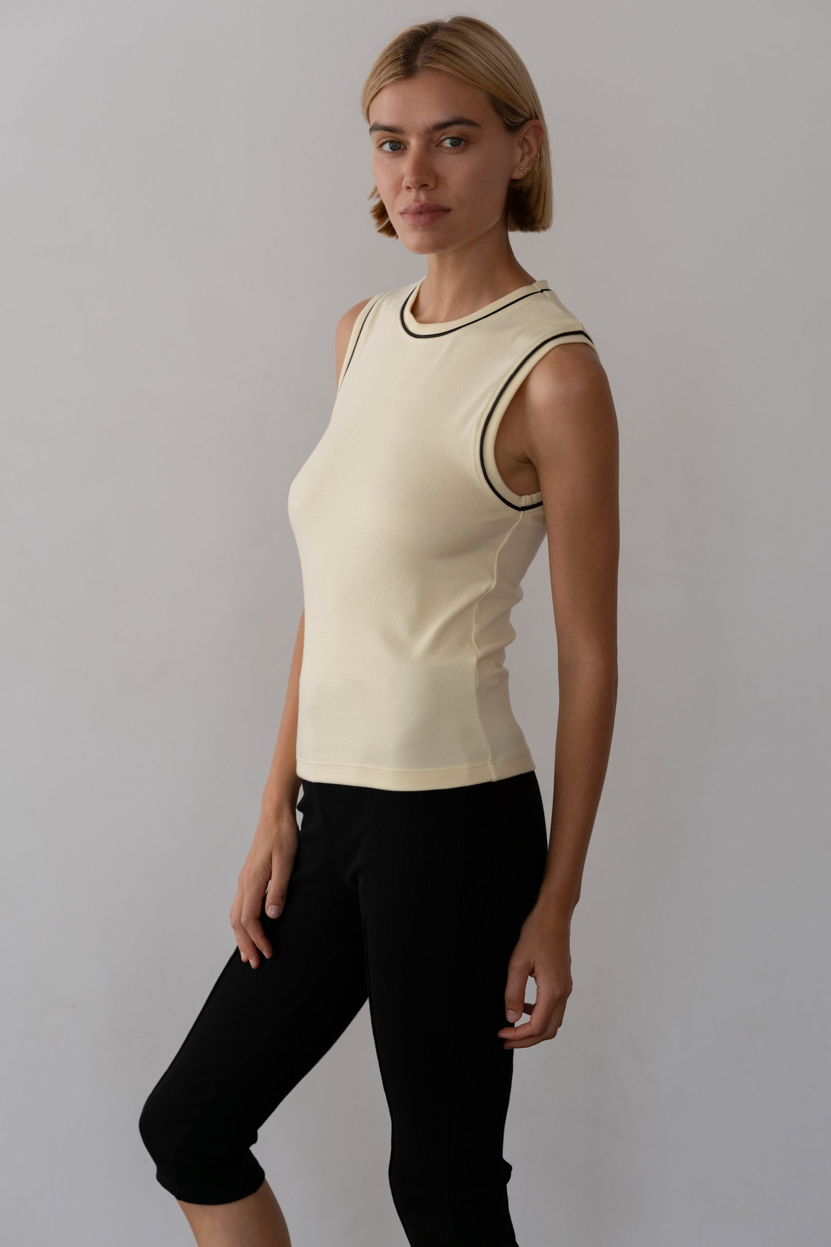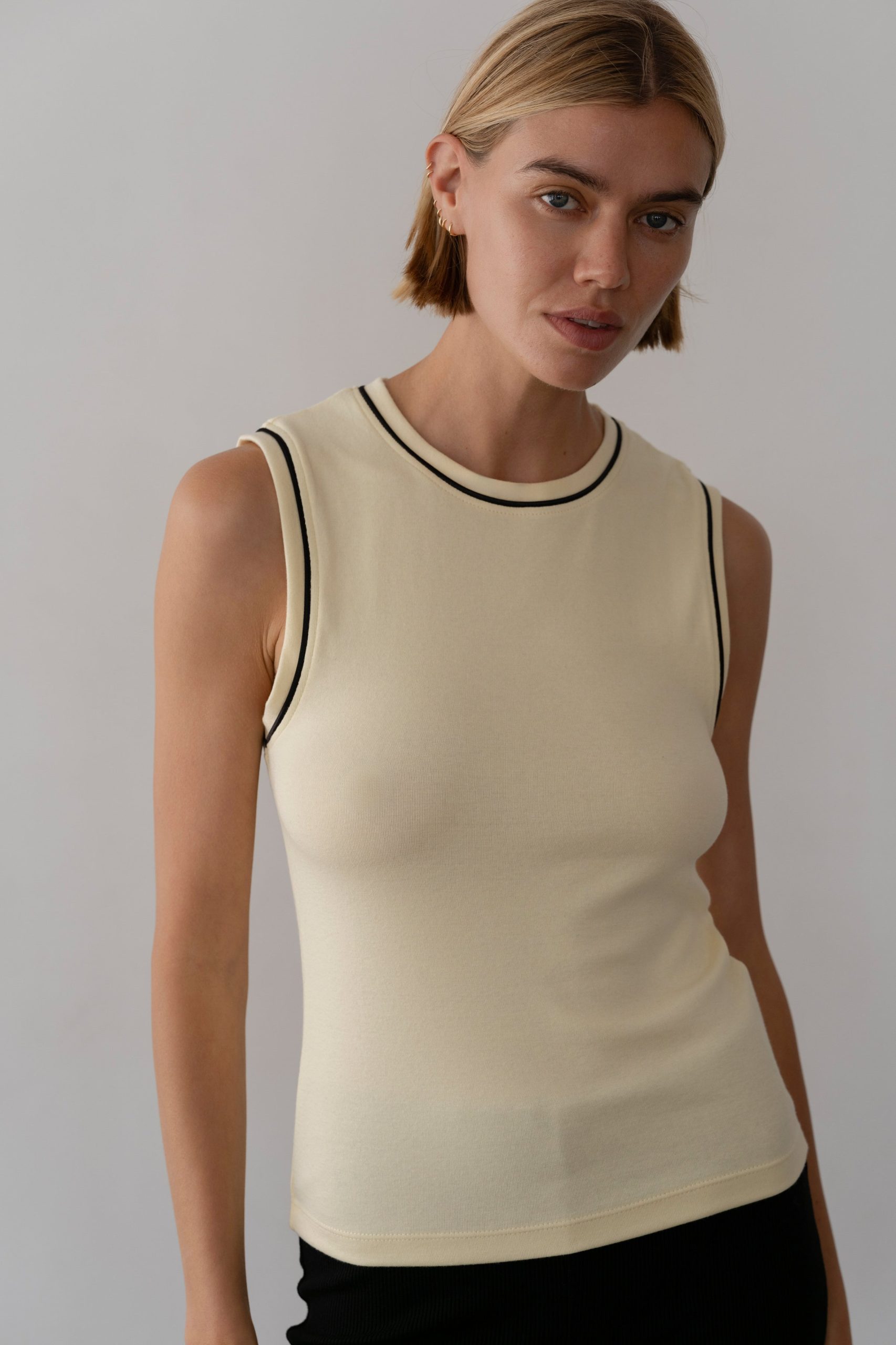 The Baby Rib Contrast Tank is crafted from our butter-soft baby rib fabric and features contrast trim at the armholes and neckline, sleeveless design, fitted silhouette, and full-length cut.