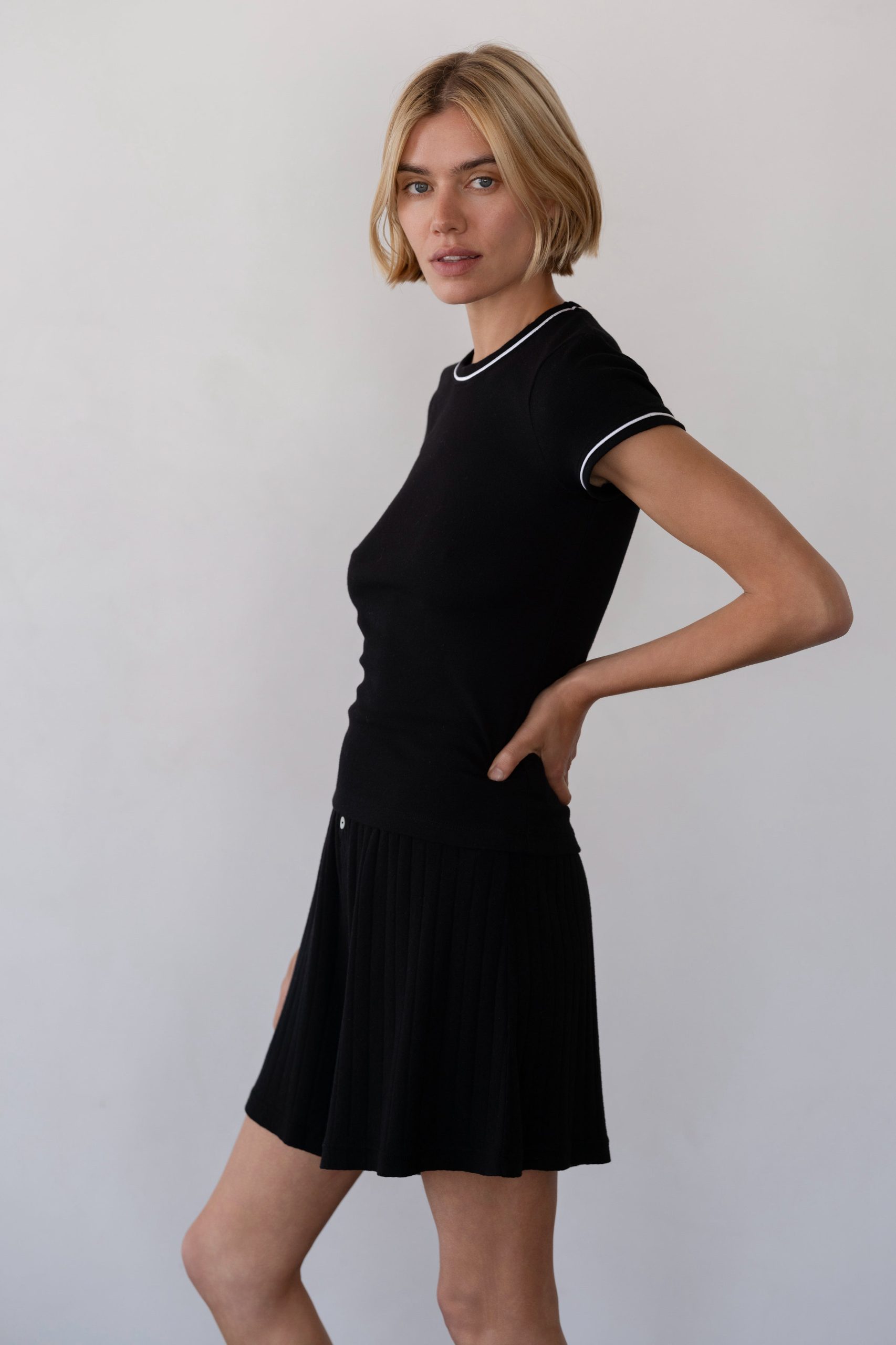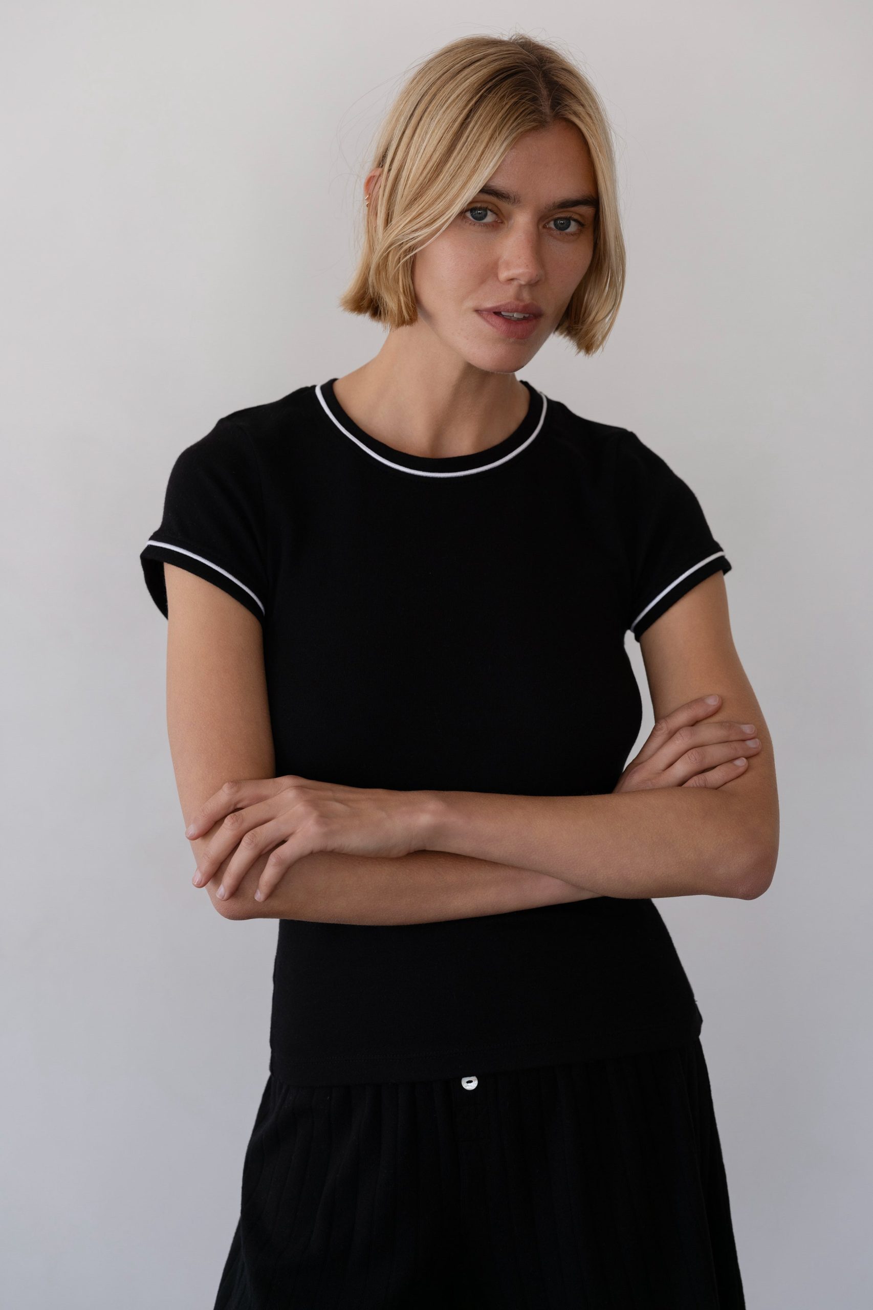 The Baby Rib Contrast Tee is crafted from our butter-soft baby rib fabric, featuring contrast trim at the sleeves and neckline, short sleeves, fitted silhouette, and a full-length cut.
