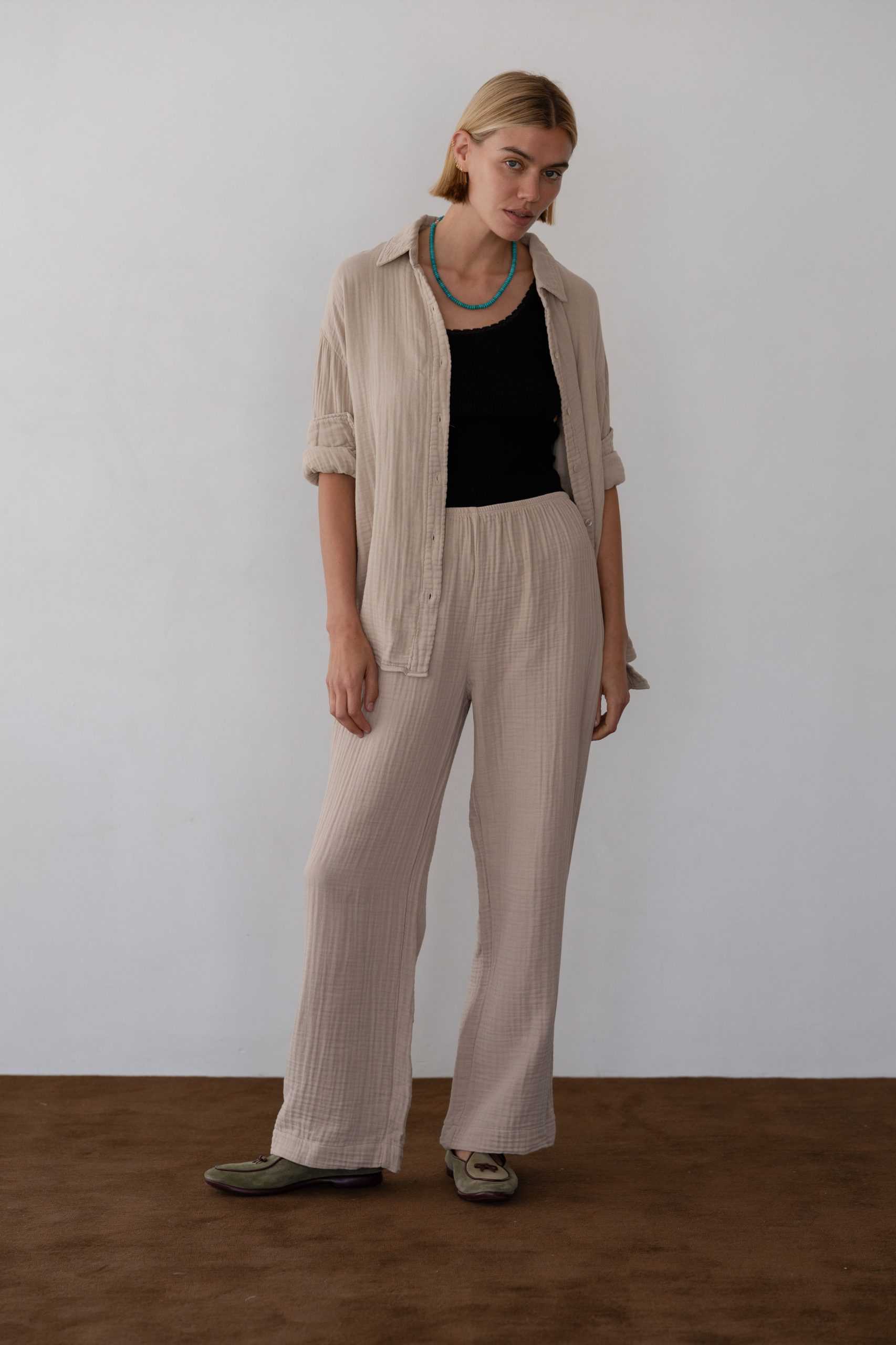 The Bubble Crop Simple Pant is crafted from ultra-soft, lightweight 100% cotton gauze and features an easy elastic waistband, cropped fit, and a gauzy texture.