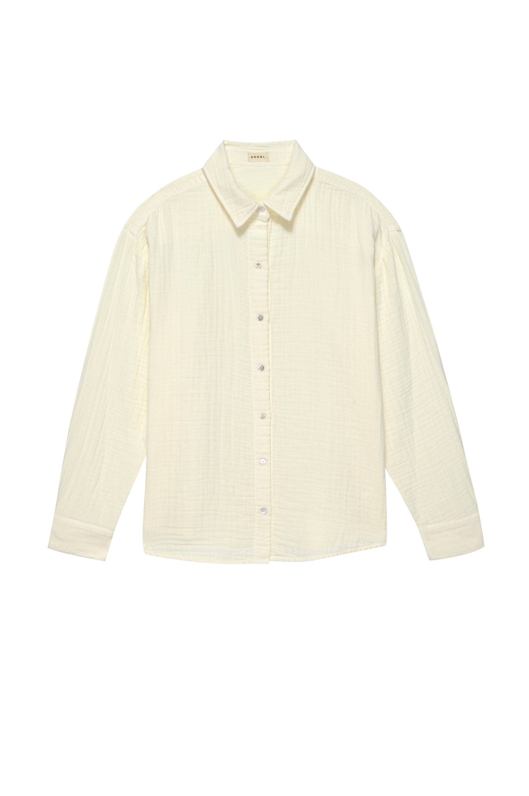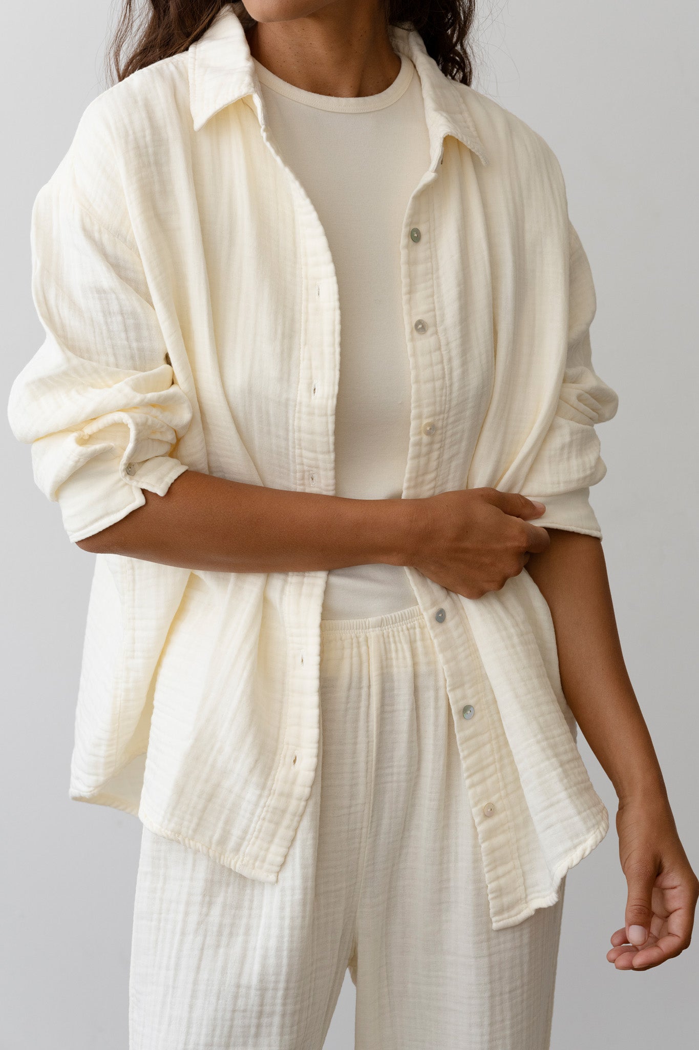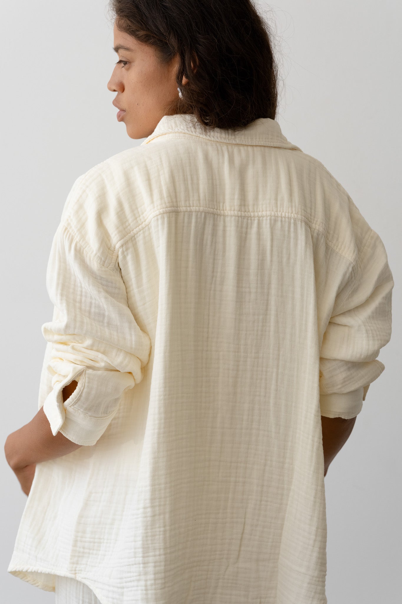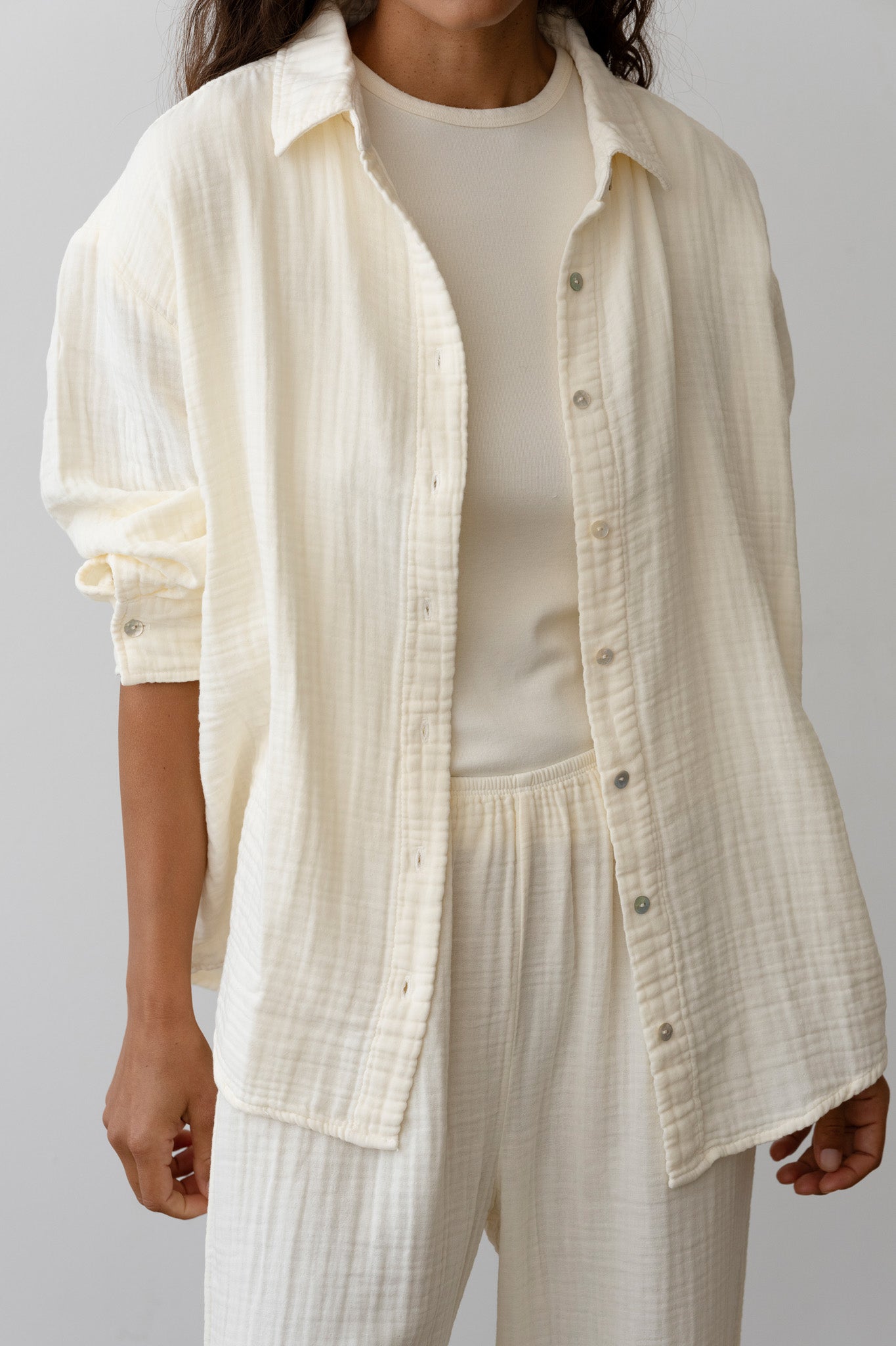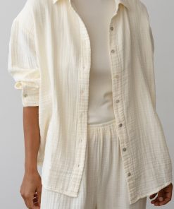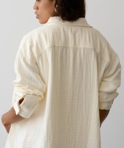 The Bubble Shirt is crafted from ultra-soft, lightweight 100% cotton gauze and features a relaxed silhouette, mother of pearl buttons, and a gauzy texture.