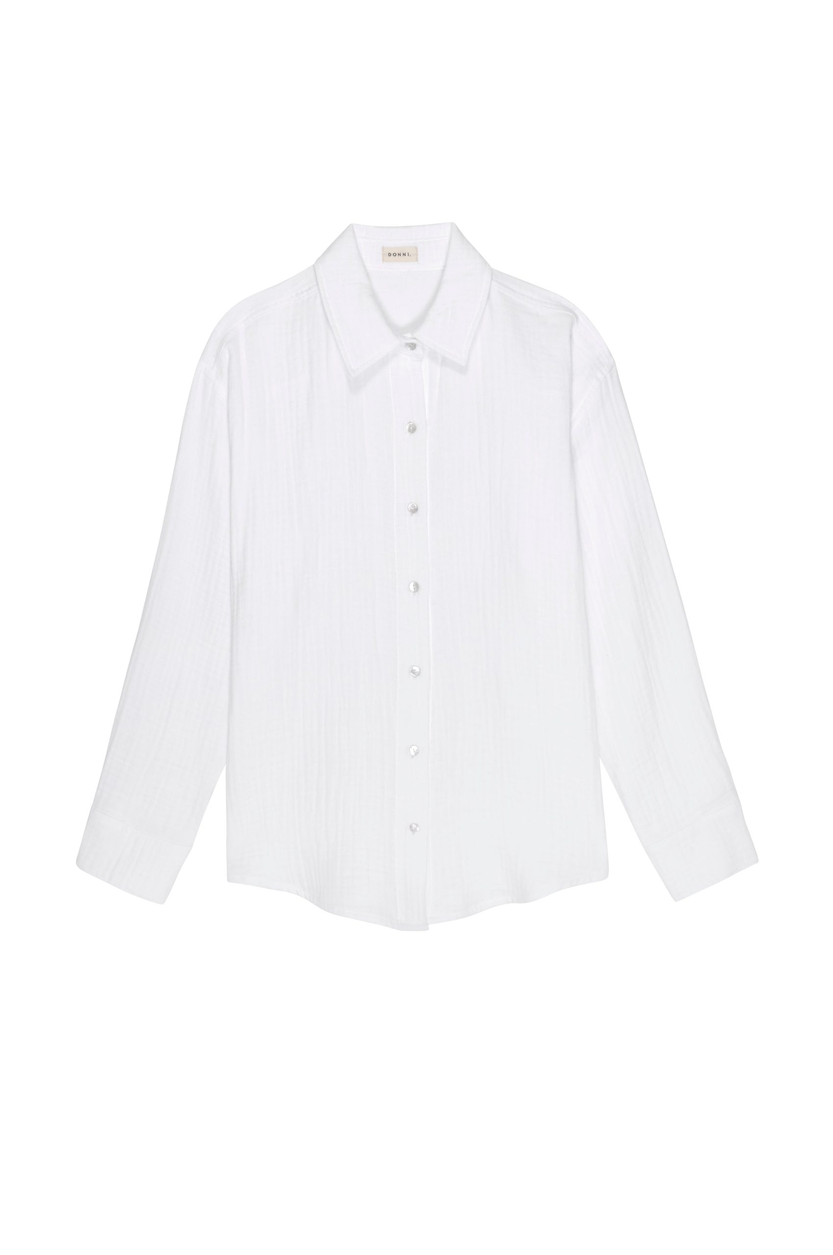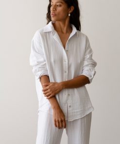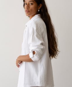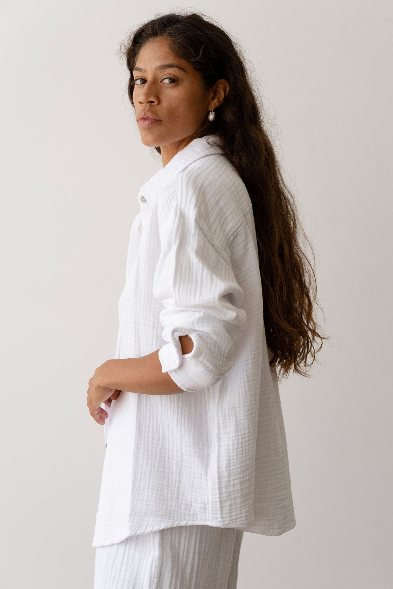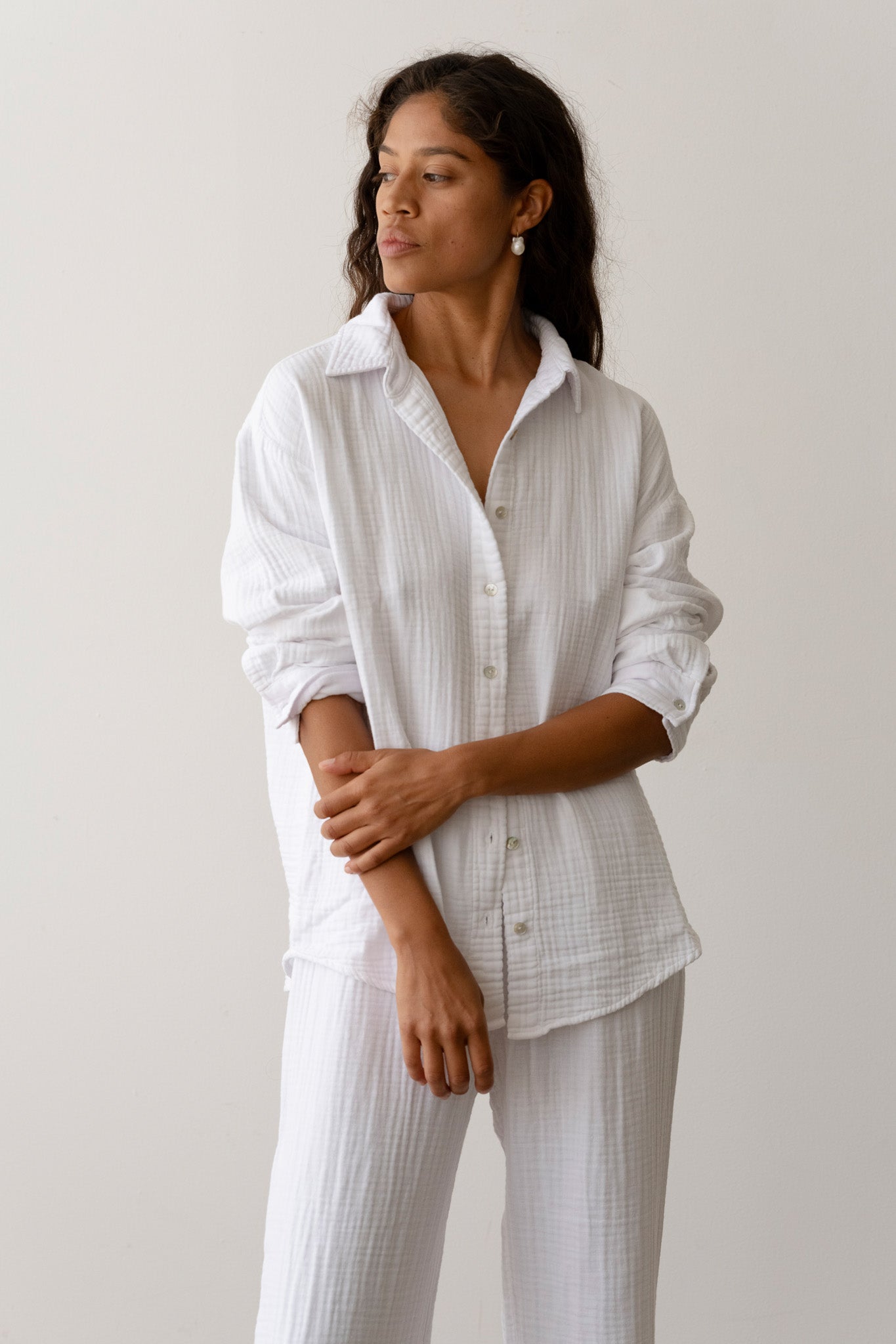 The Bubble Shirt is crafted from ultra-soft, lightweight 100% cotton gauze and features a relaxed silhouette, mother of pearl buttons, and a gauzy texture.