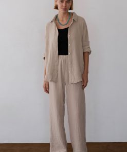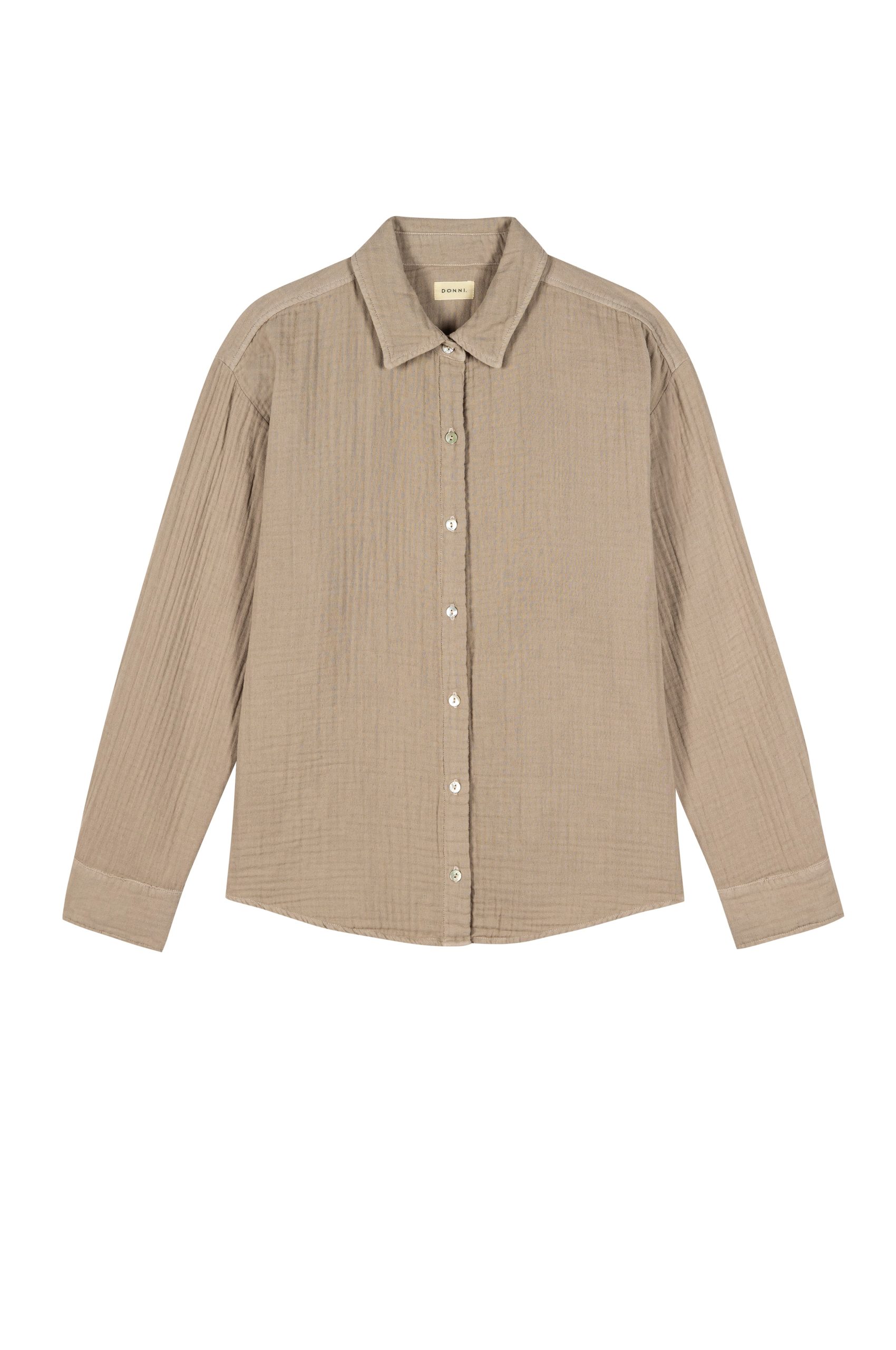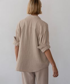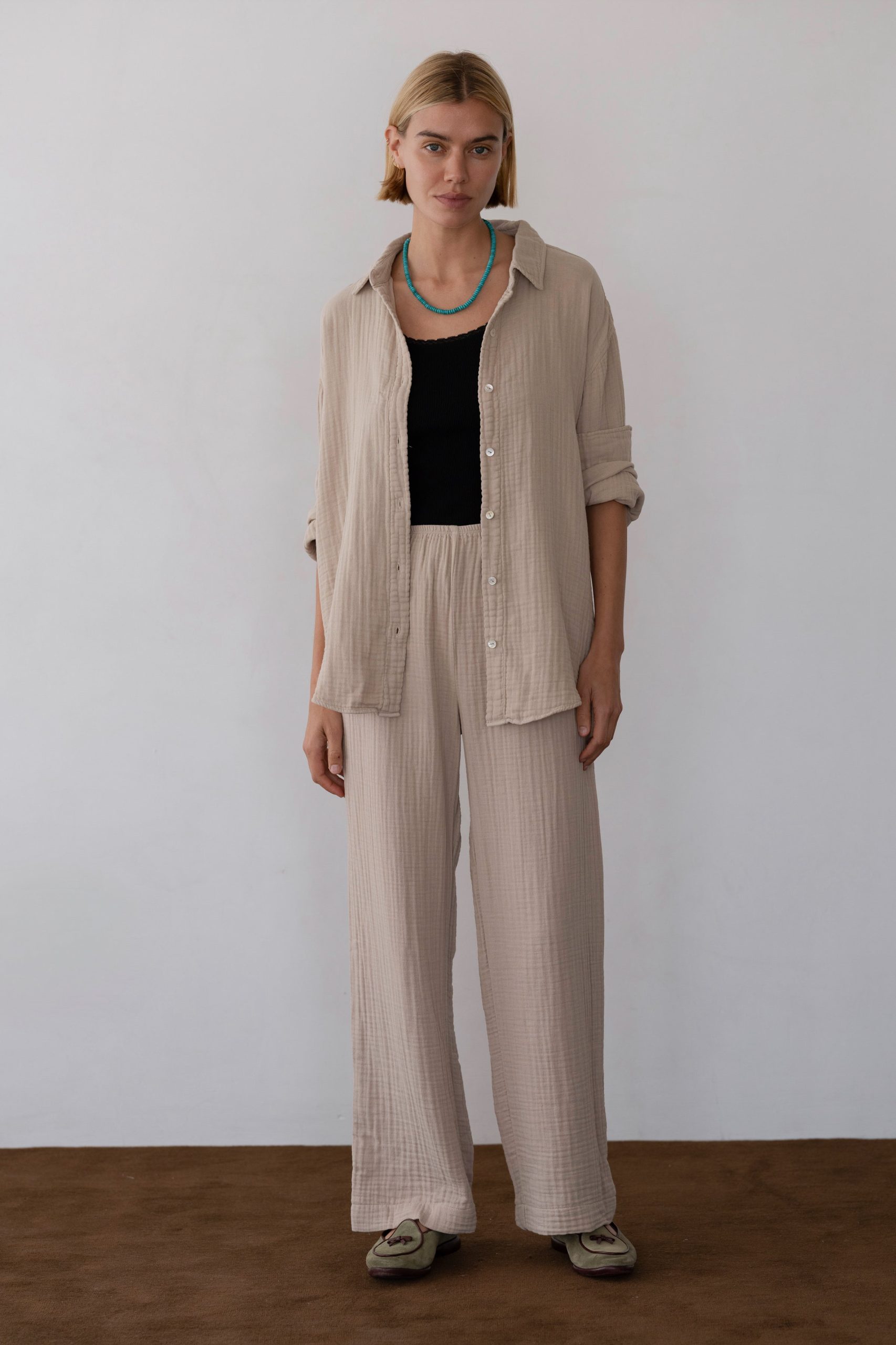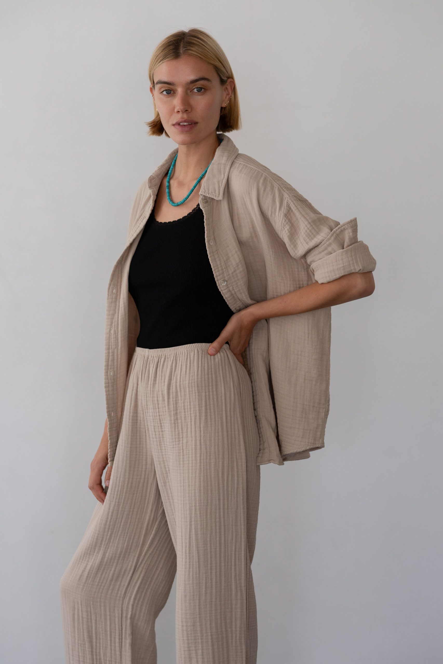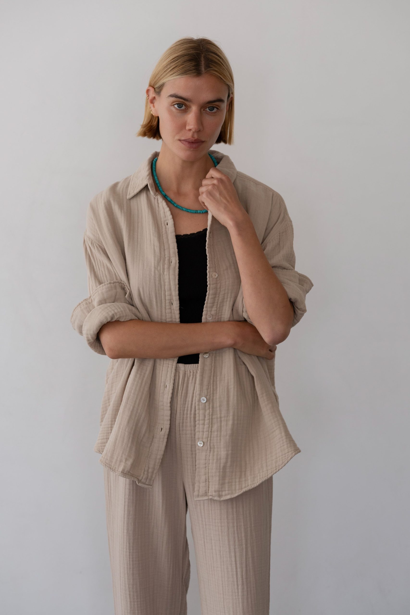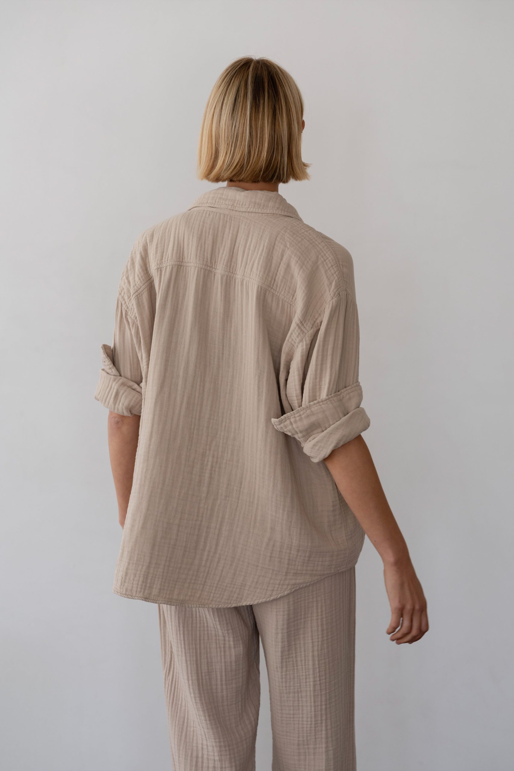 The Bubble Shirt is crafted from ultra-soft, lightweight 100% cotton gauze and features a relaxed silhouette, mother of pearl buttons, and a gauzy texture.