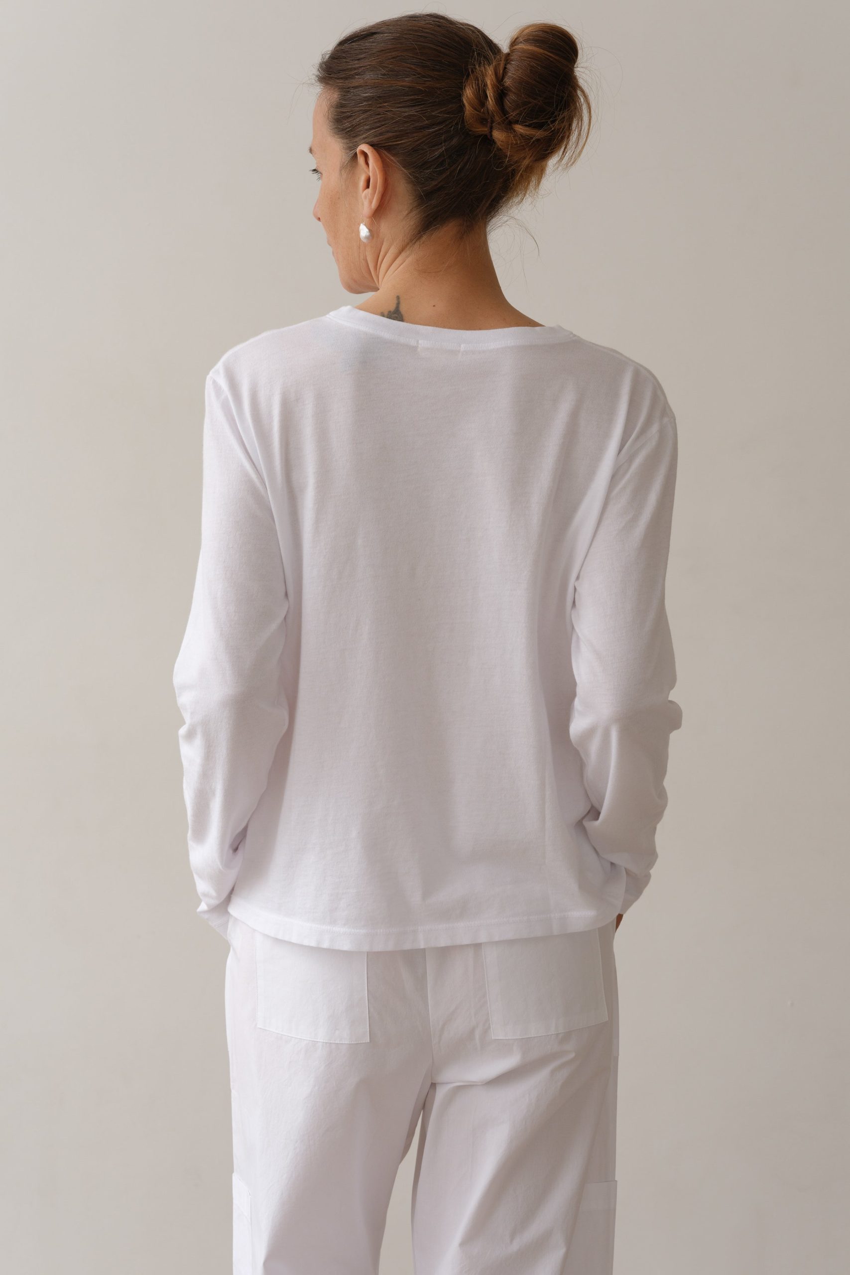 The Jersey V-Neck Long Sleeve is crafted from our signature cotton jersey for a soft, lightweight feel. Designed with a relaxed fit and classic v-neck, it's an effortless essential for everyday wear.