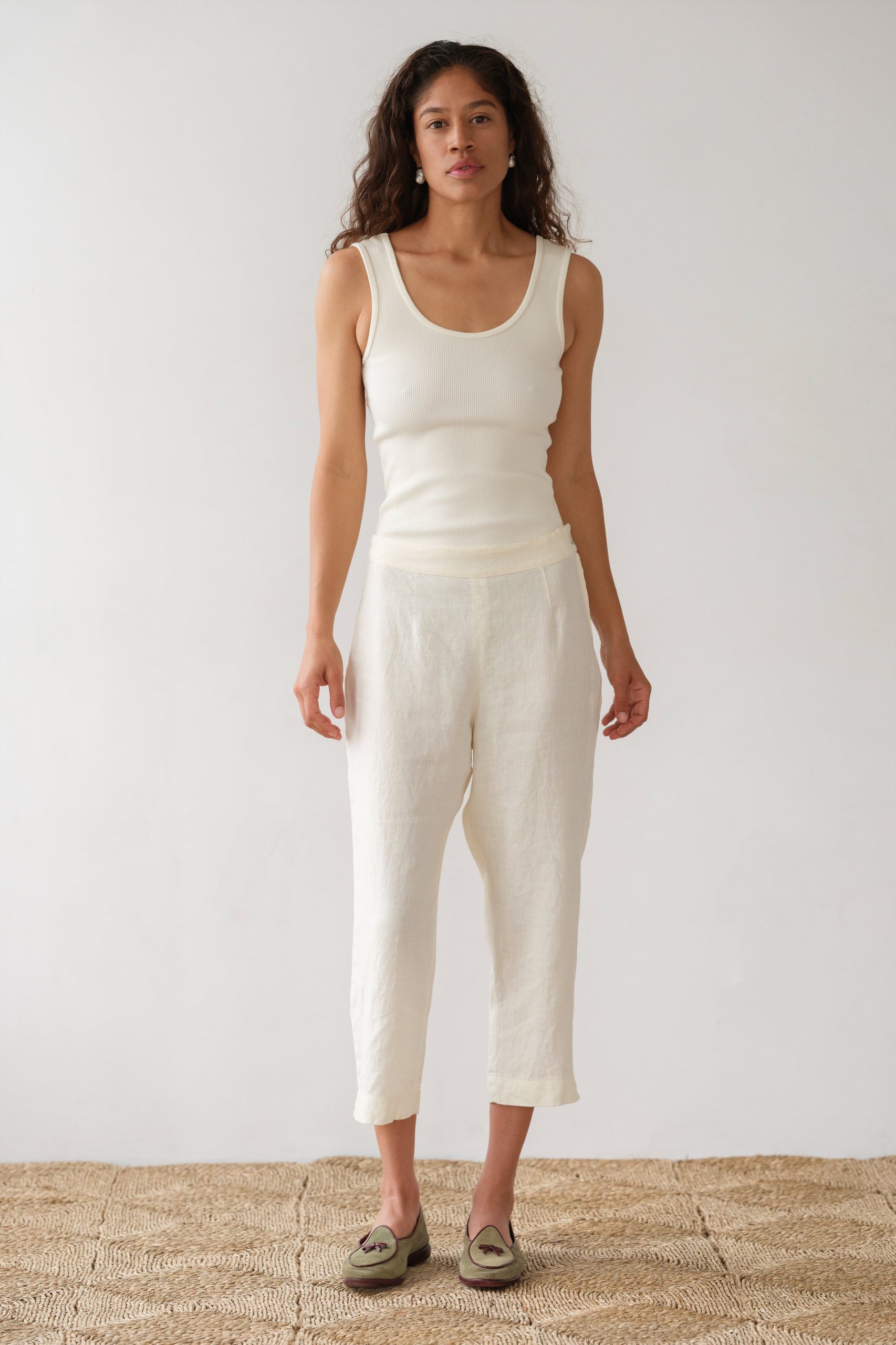 The Linen Capri Pant is crafted from our signature lightweight linen. Featuring a cropped fit, a left-side zip closure with a mother of pearl button, and subtle slits at the hem for an effortlessly refined finish.