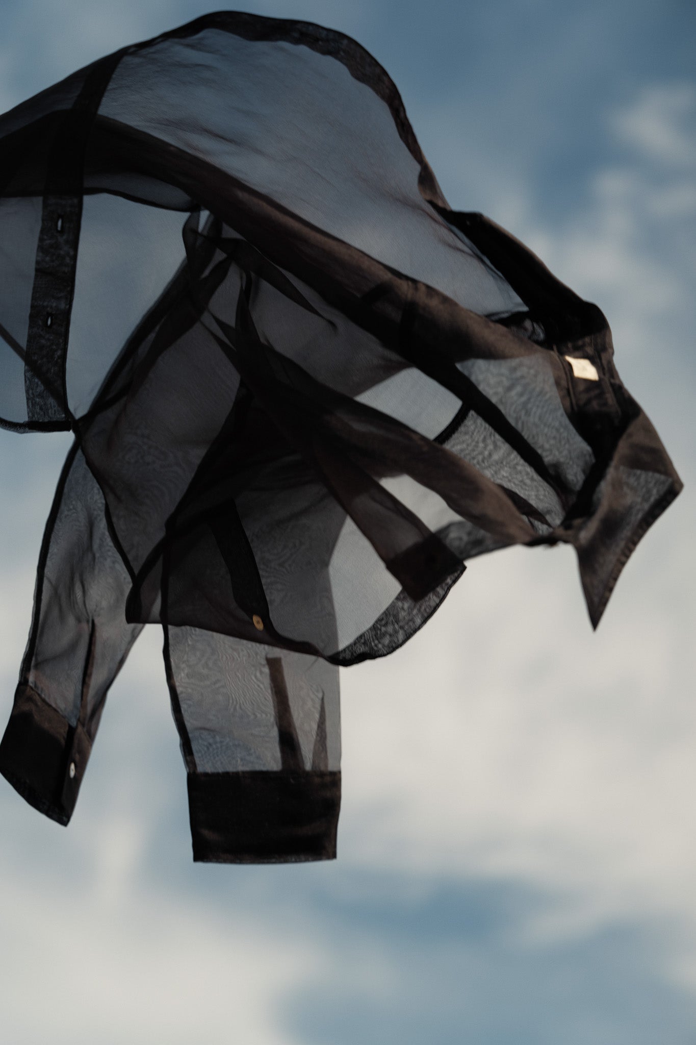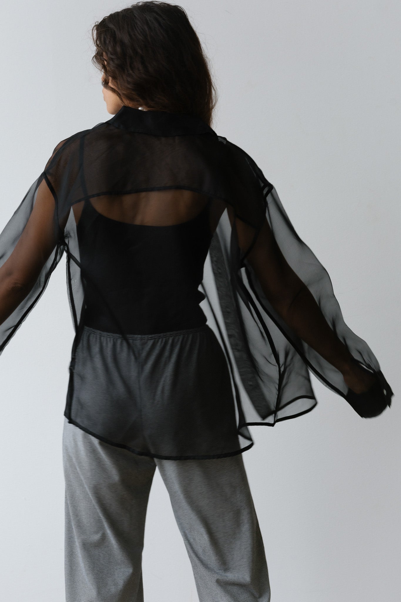 The Organza Shirt is crafted from 100% silk. We love this top worn on it's own or as a light jacket. It features, mother of pearl buttons, dropped shoulders, and a relaxed fit.