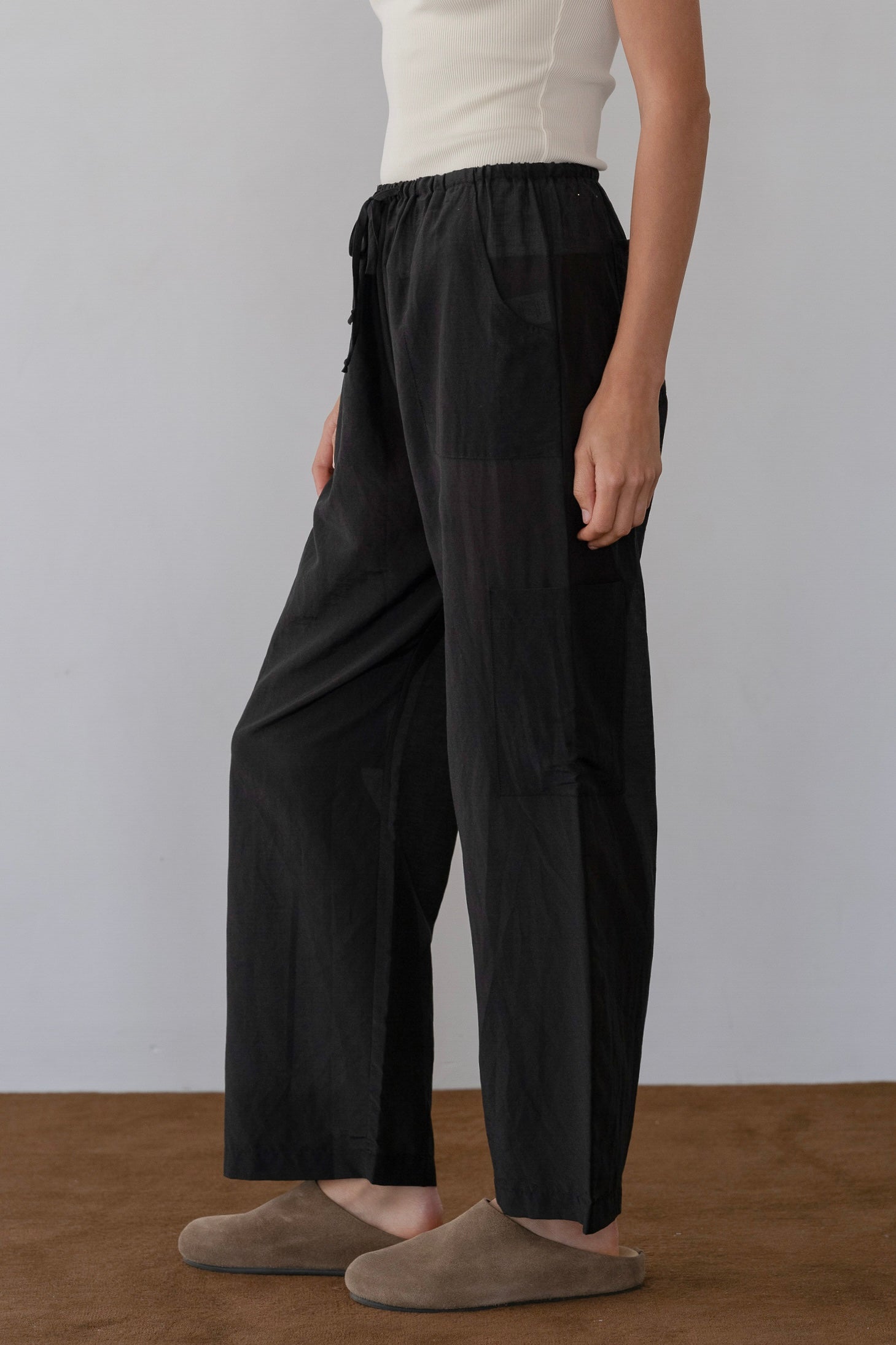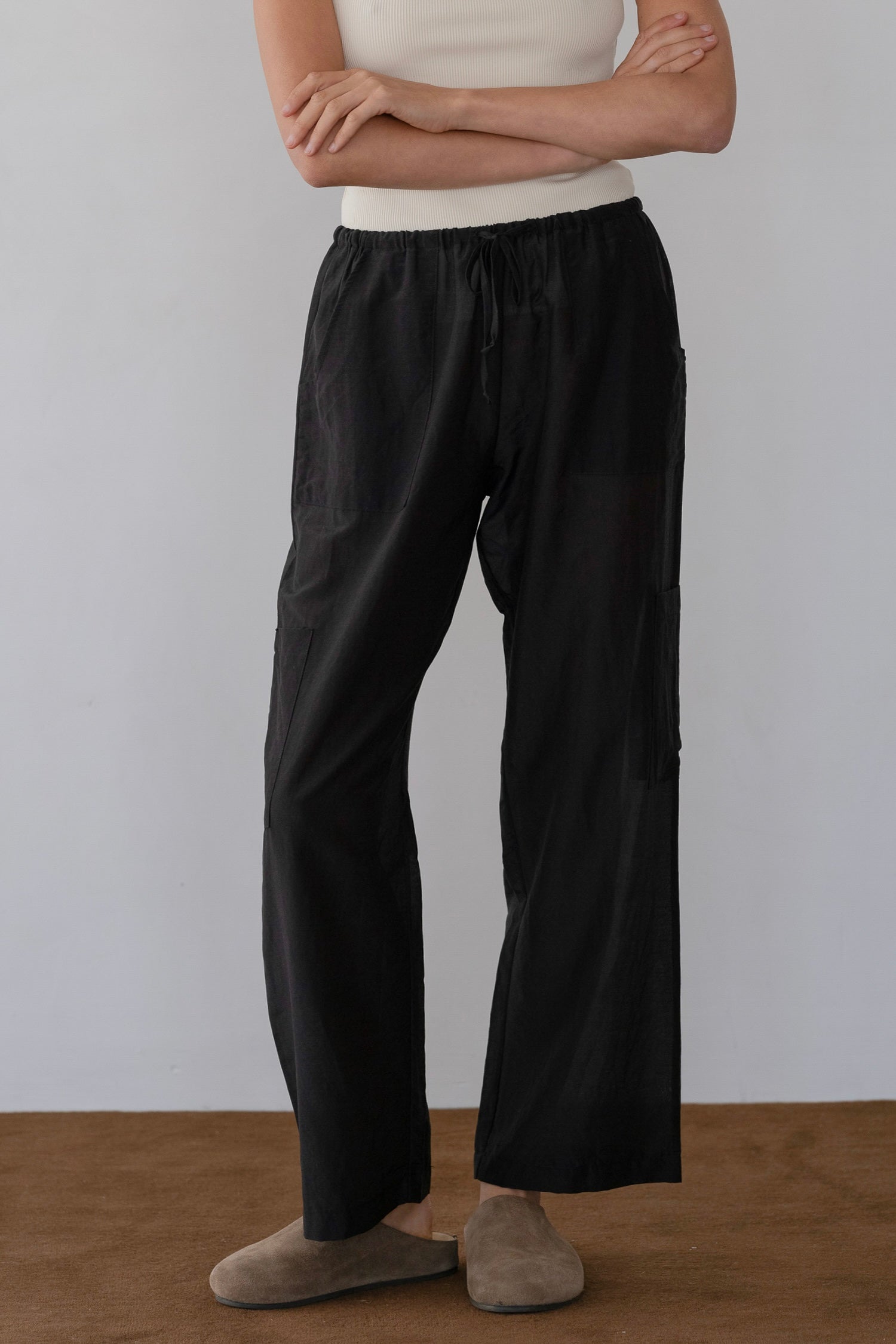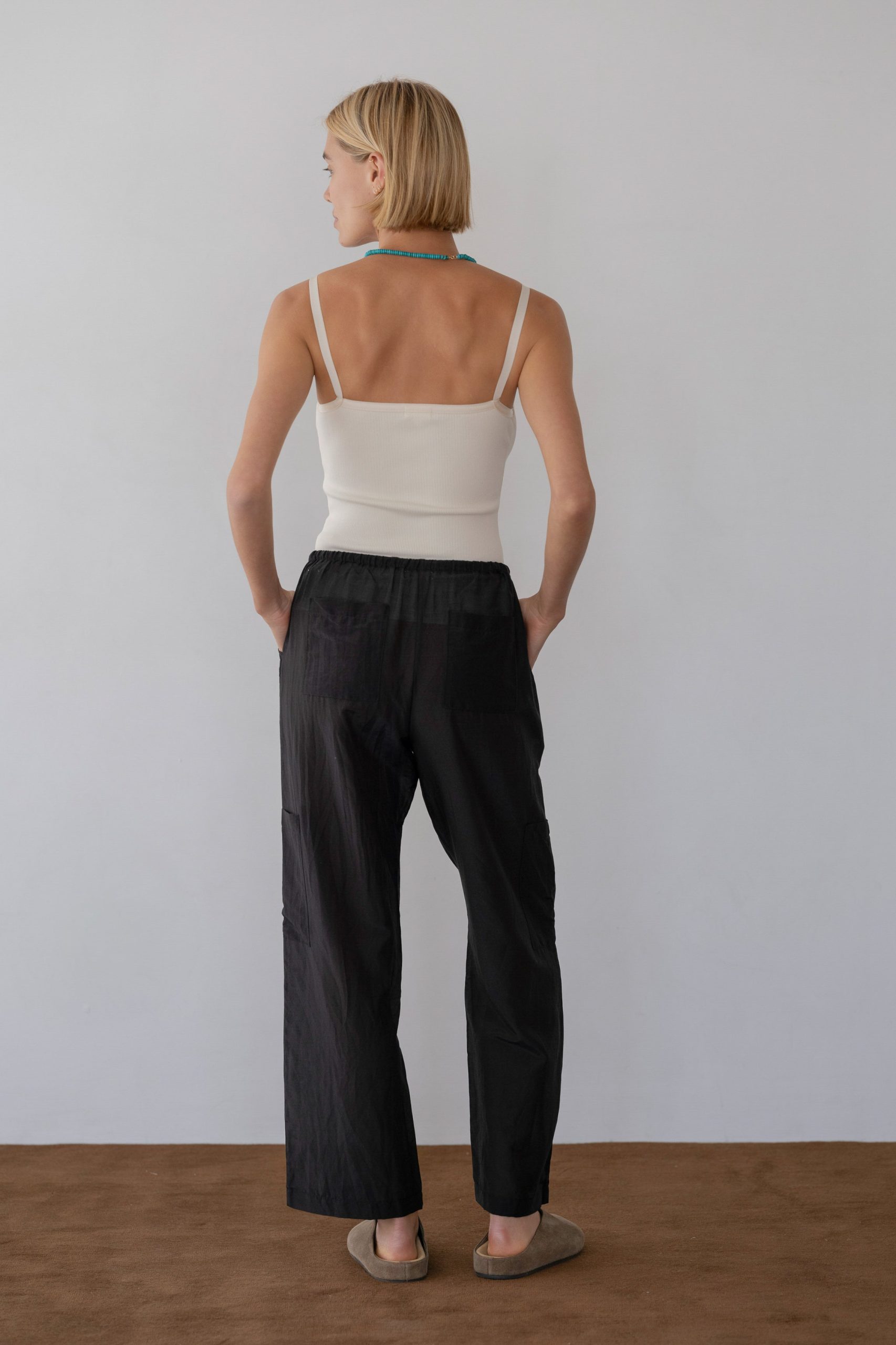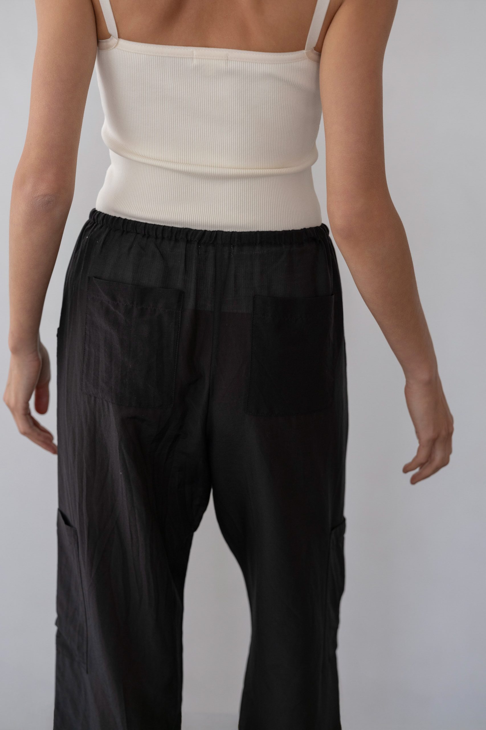 The Silk Cotton Sheer Cargo Pant is crafted from our airy silk cotton blend for a lightweight, breathable feel. Designed with a cropped silhouette and drawstring waist, it features cargo, side, and back pockets for elevated ease and everyday functionality.