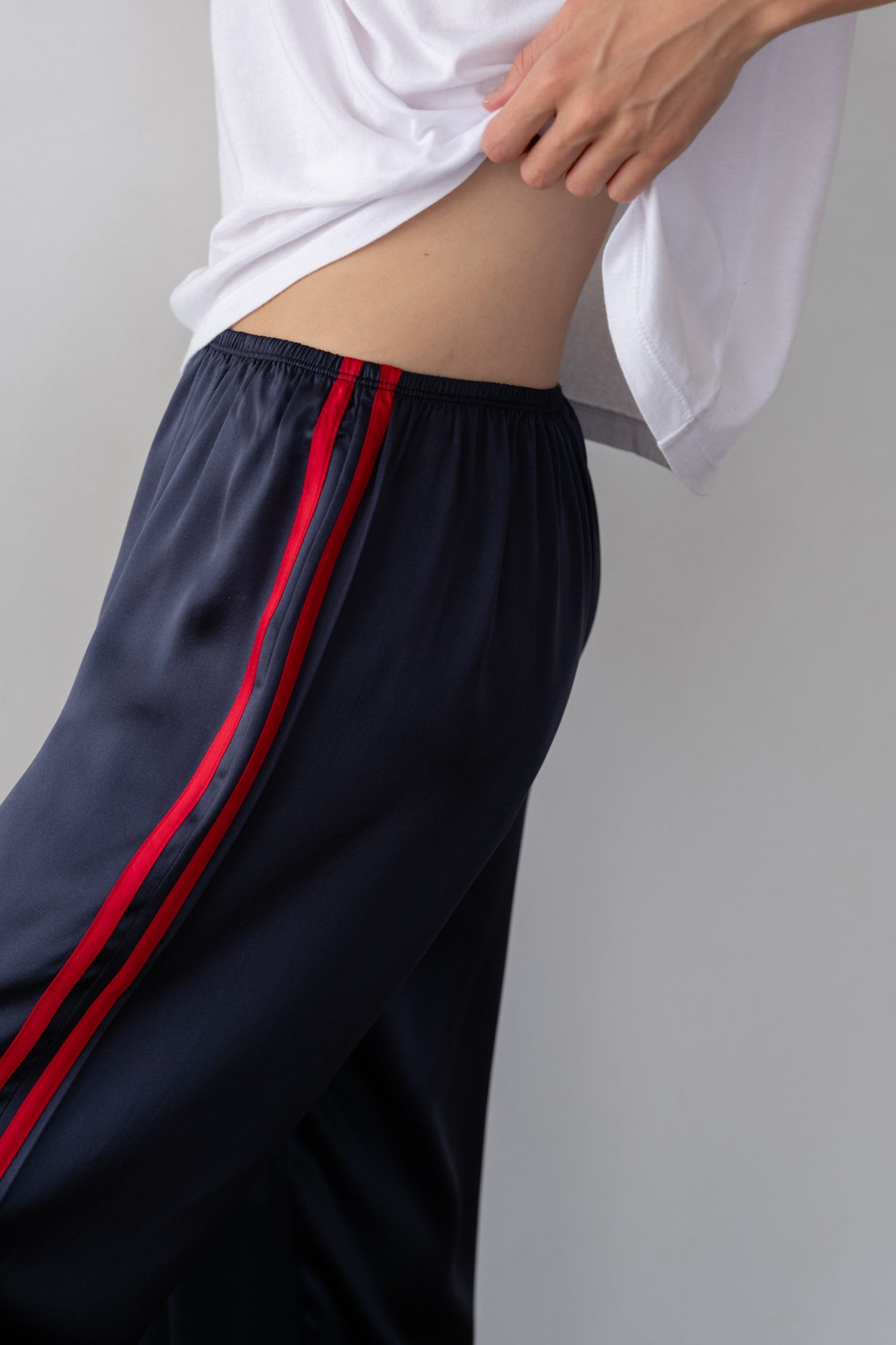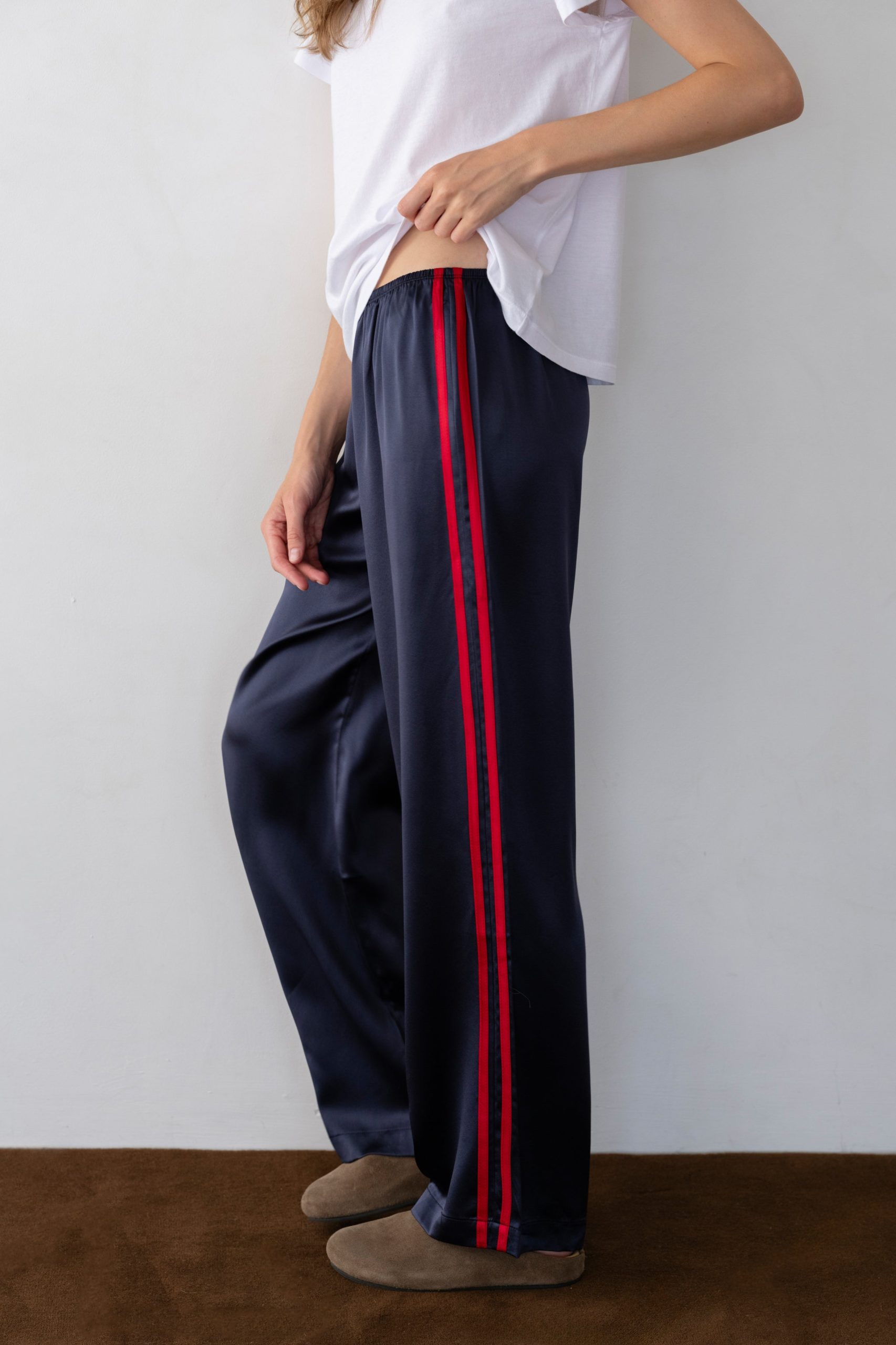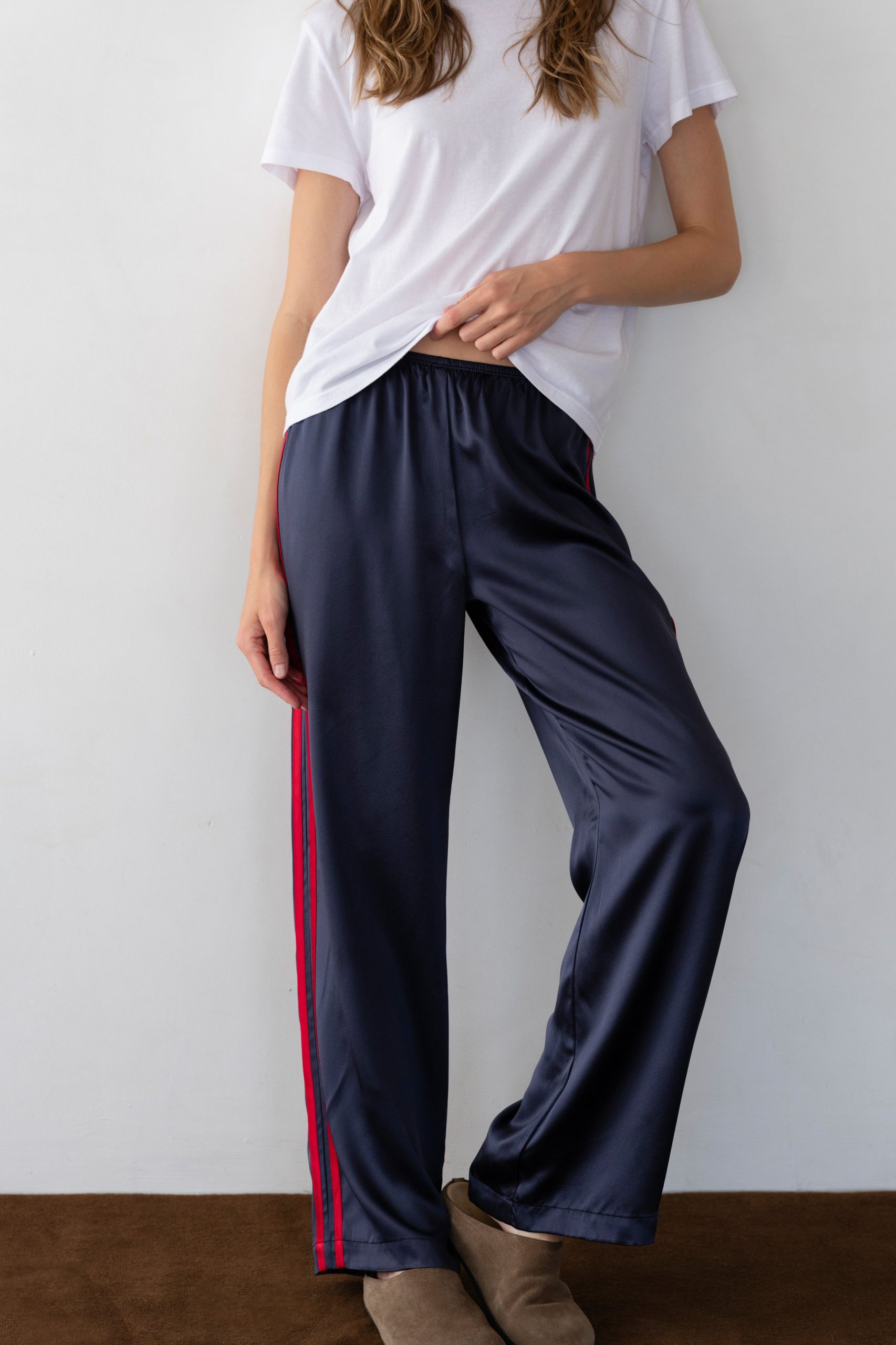 The Silk Stripe Simple Pant is crafted from our buttery-soft 100% silk charmeuse. Designed with an elastic waistband, full-length fit, and a clean, straight-leg silhouette, finished with contrast racer stripes in Bell Pepper.