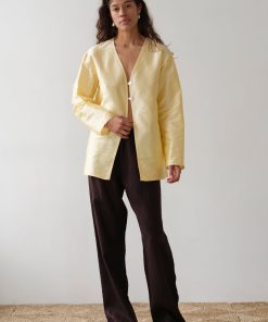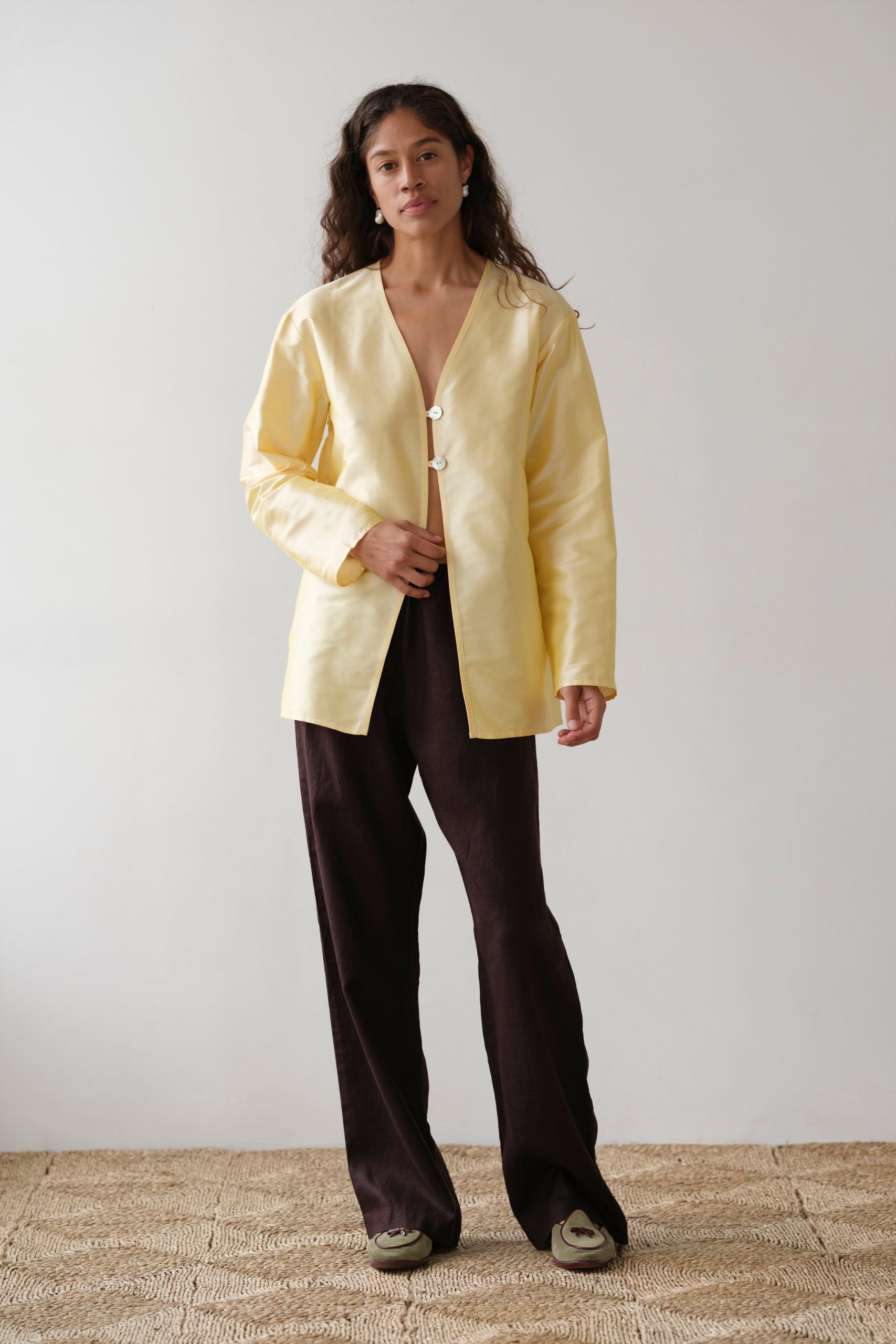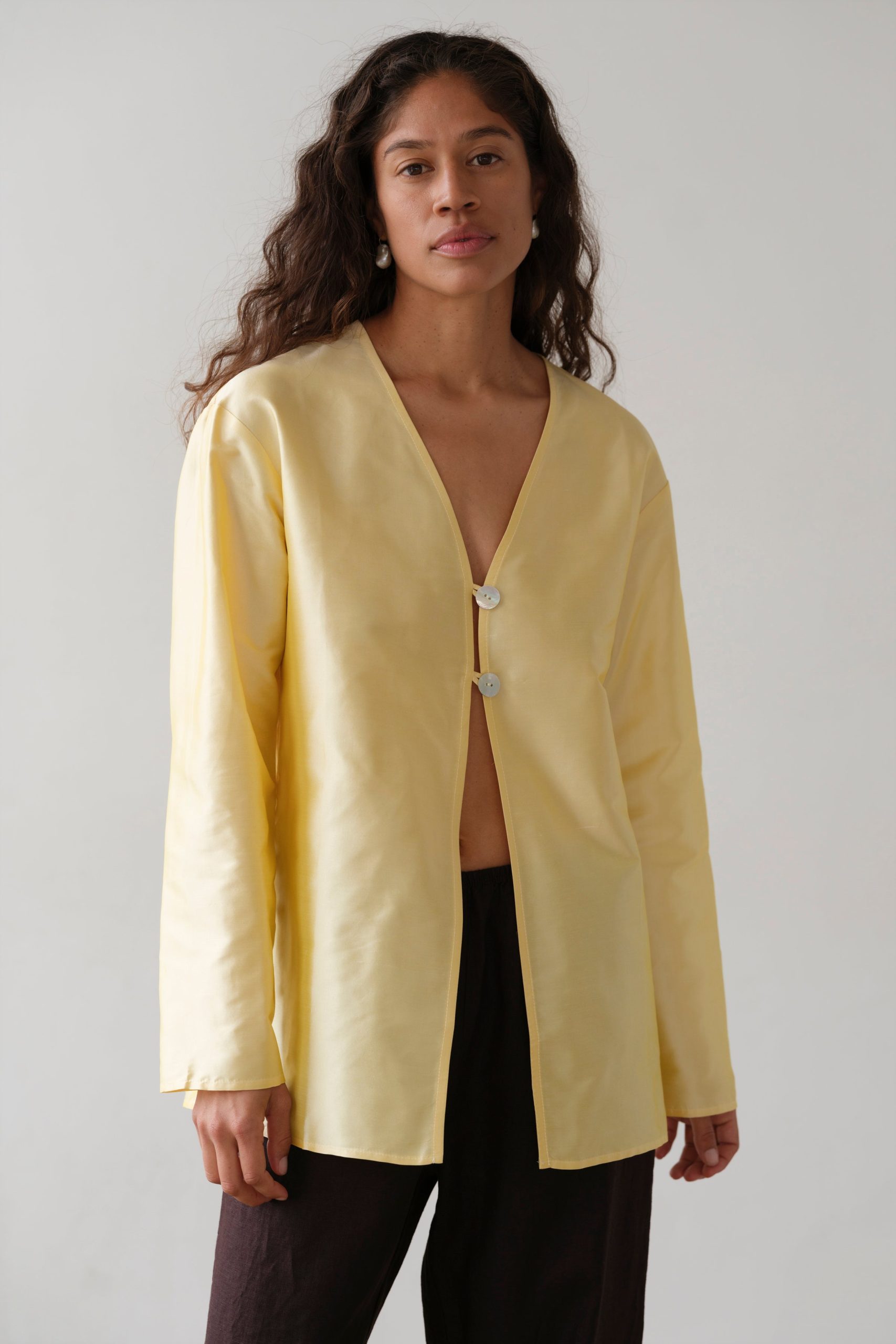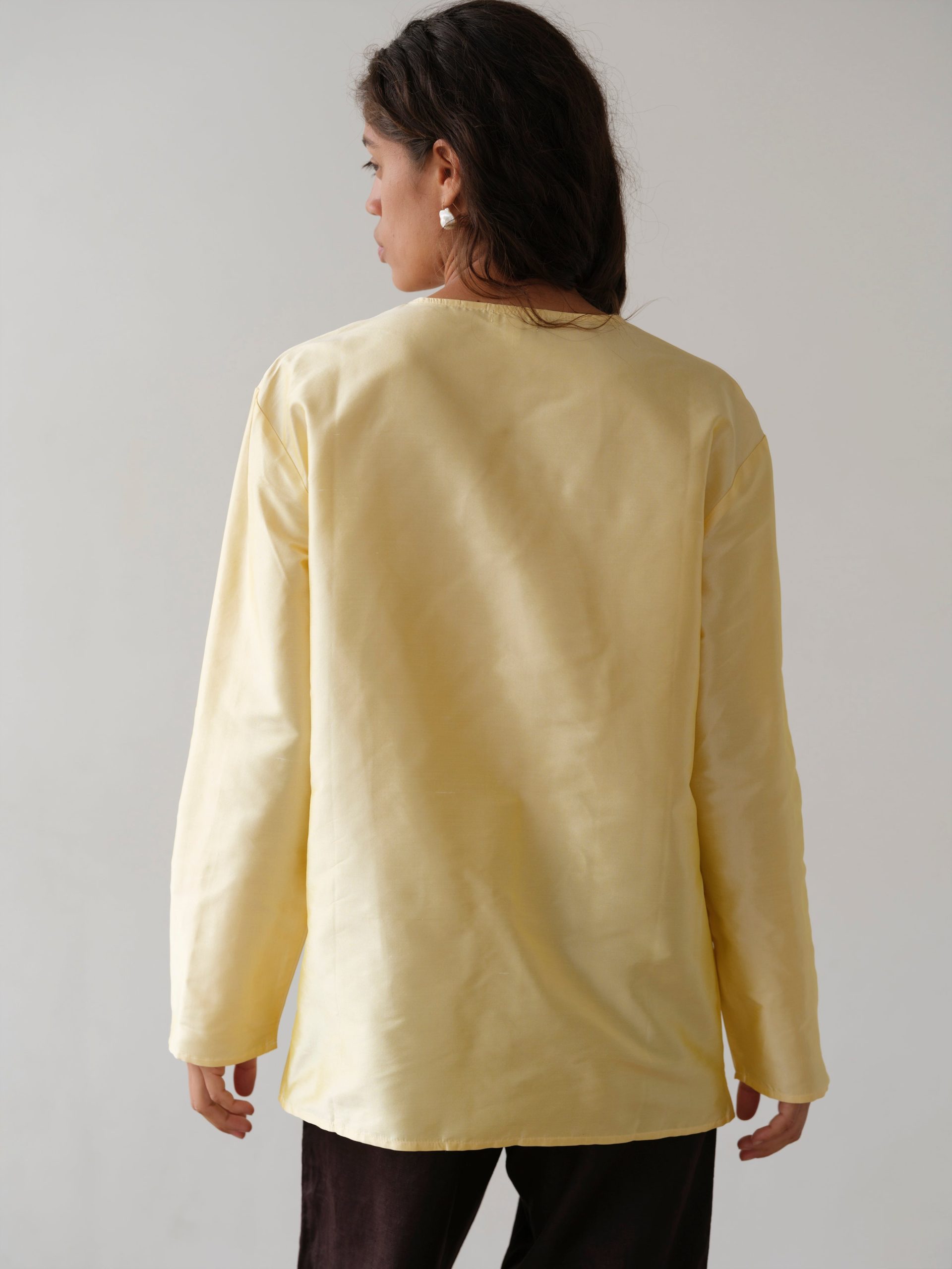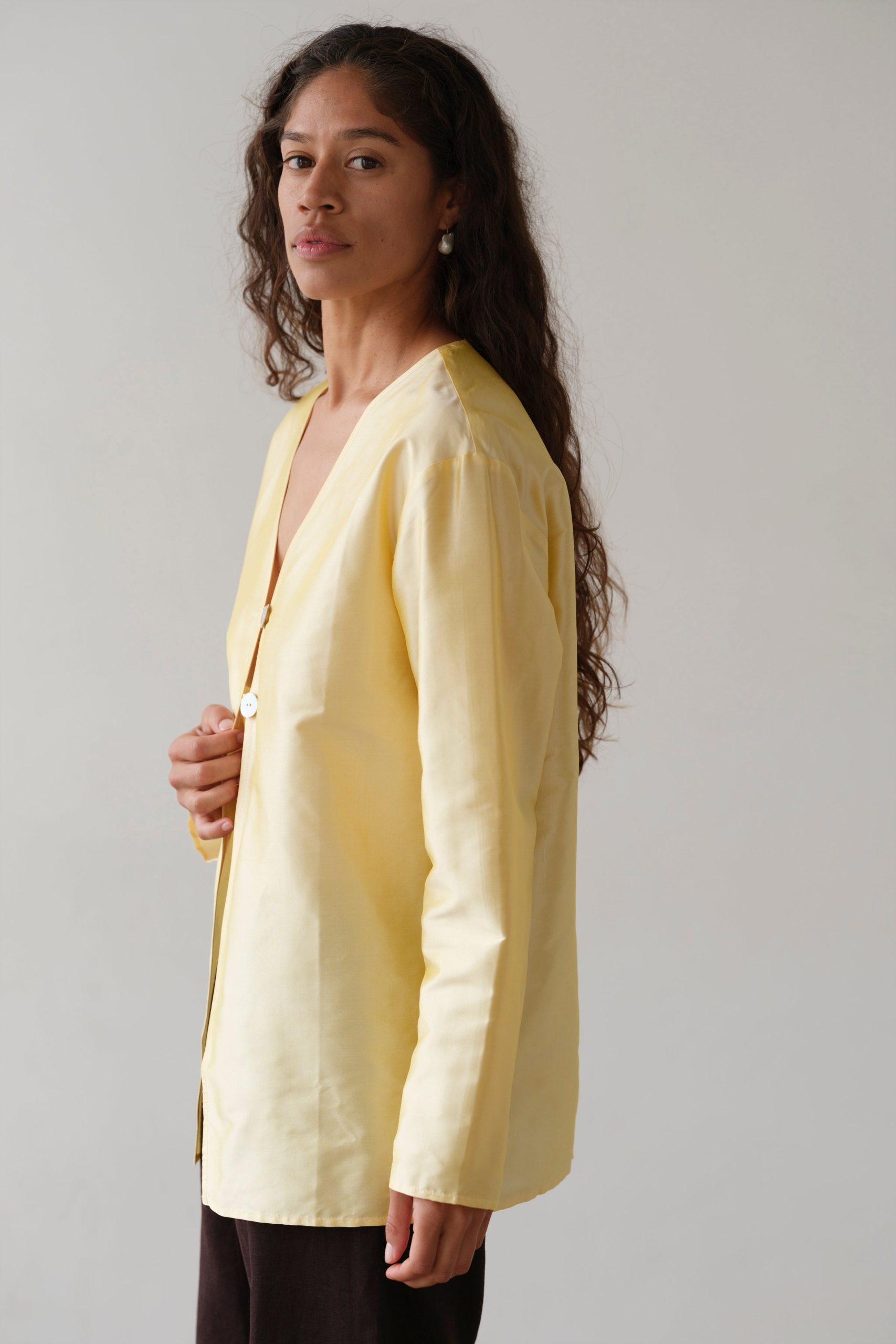 The Taffeta Split Top is crisp and lightweight. Crafted from our 100% silk taffeta fabric, featuring a relaxed fit, v-neck, and mother of pearl button.