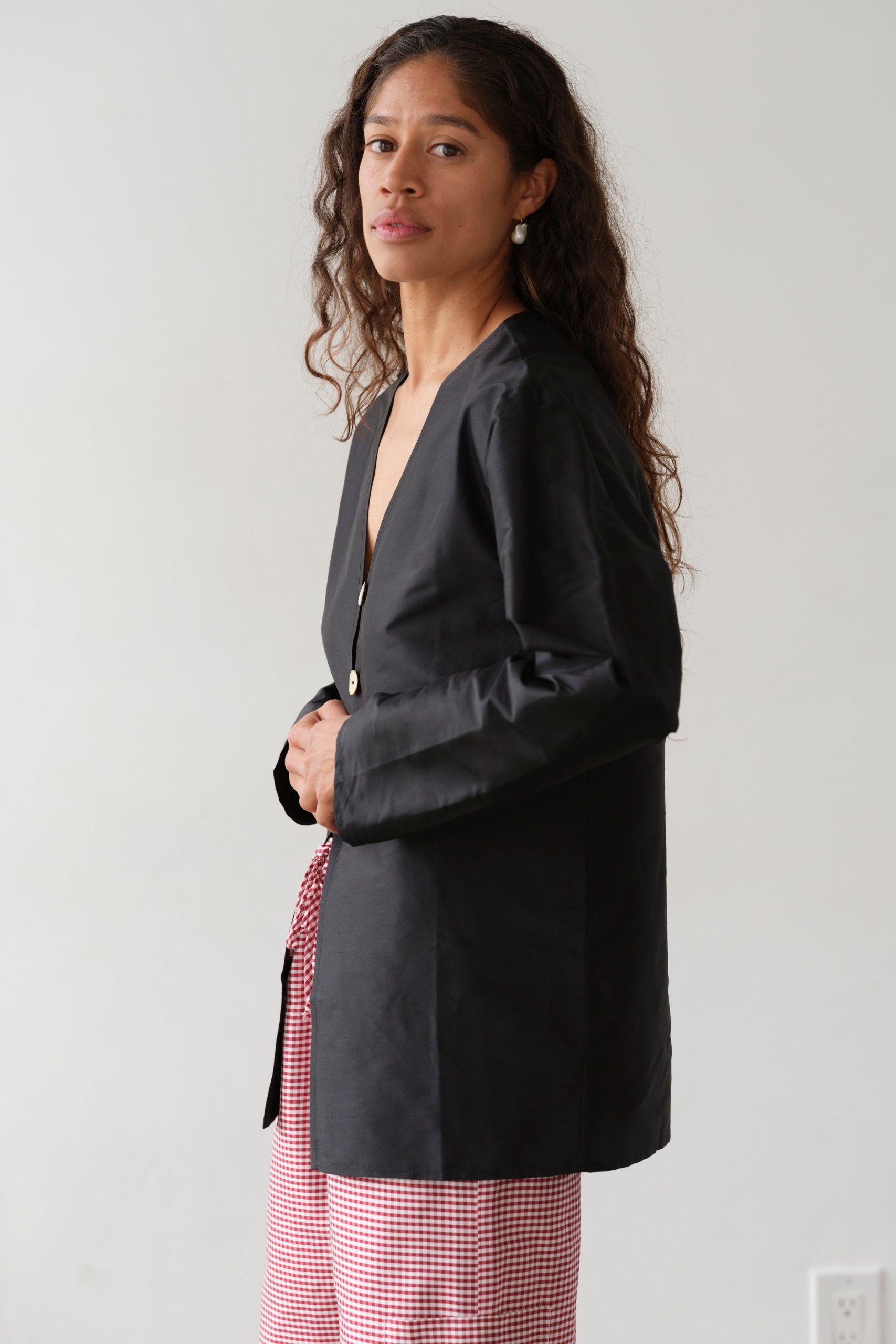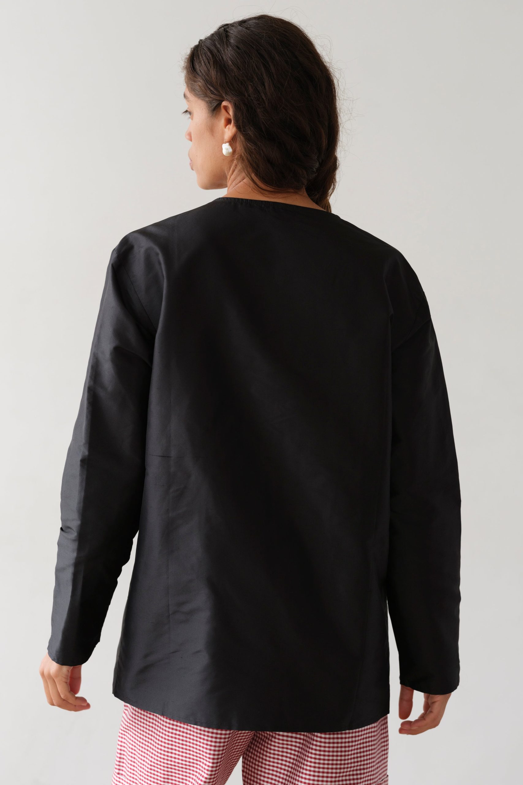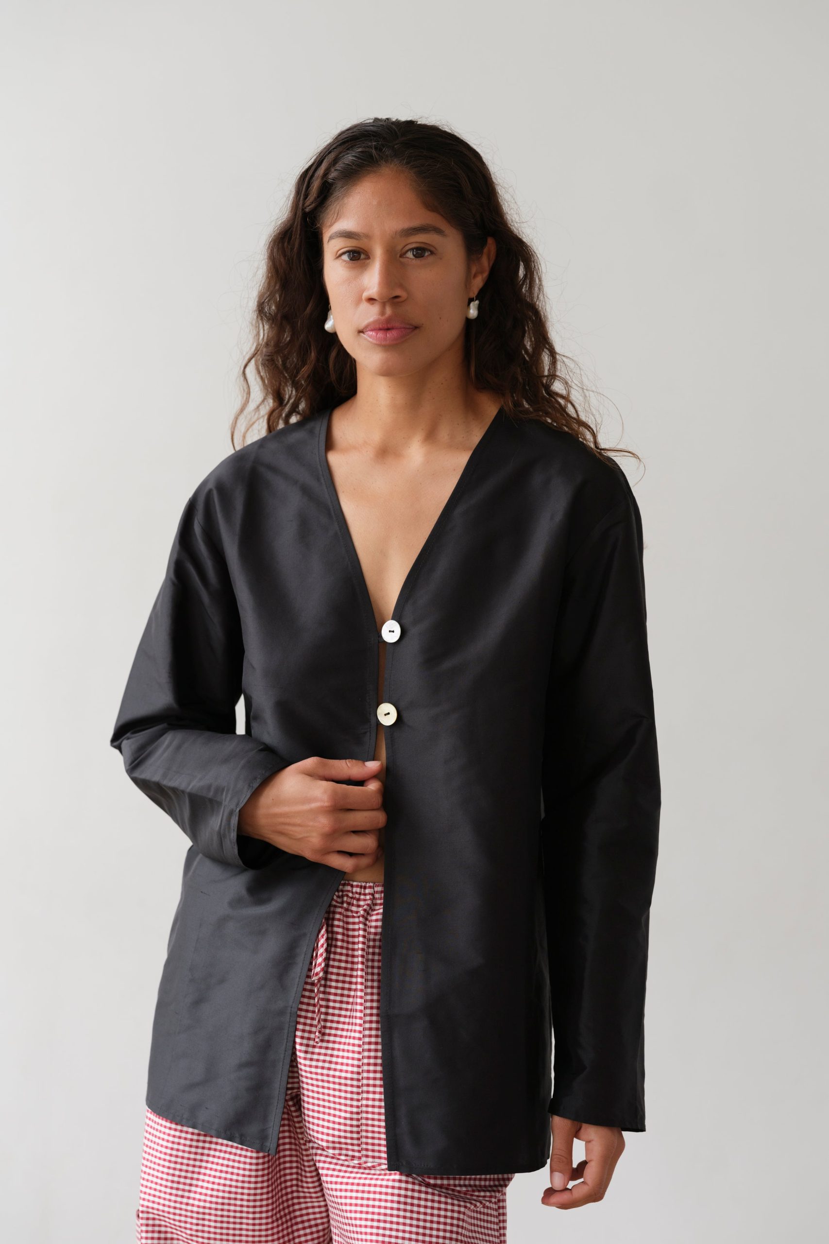 The Taffeta Split Top is crisp and lightweight. Crafted from our 100% silk taffeta fabric, featuring a relaxed fit, v-neck, and mother of pearl button.