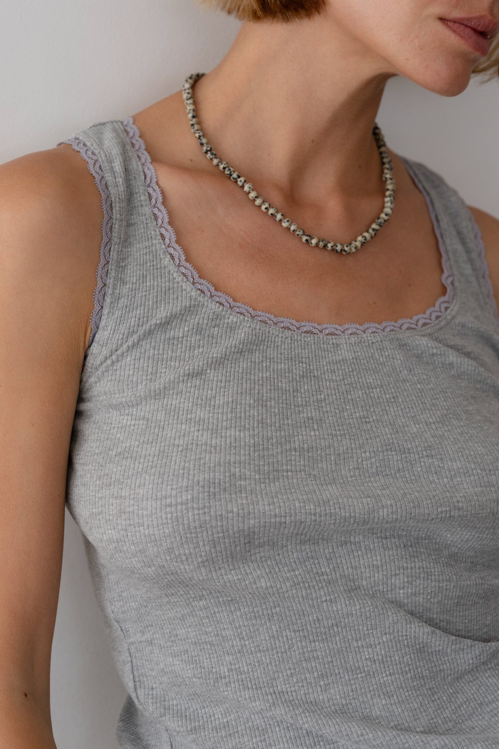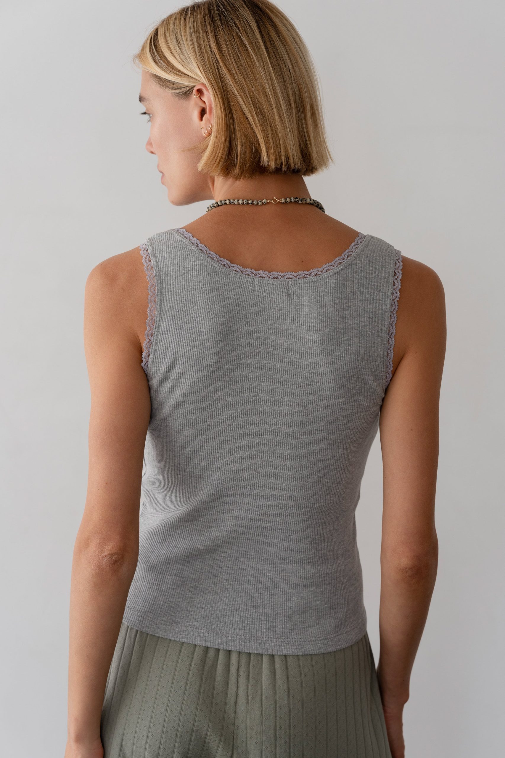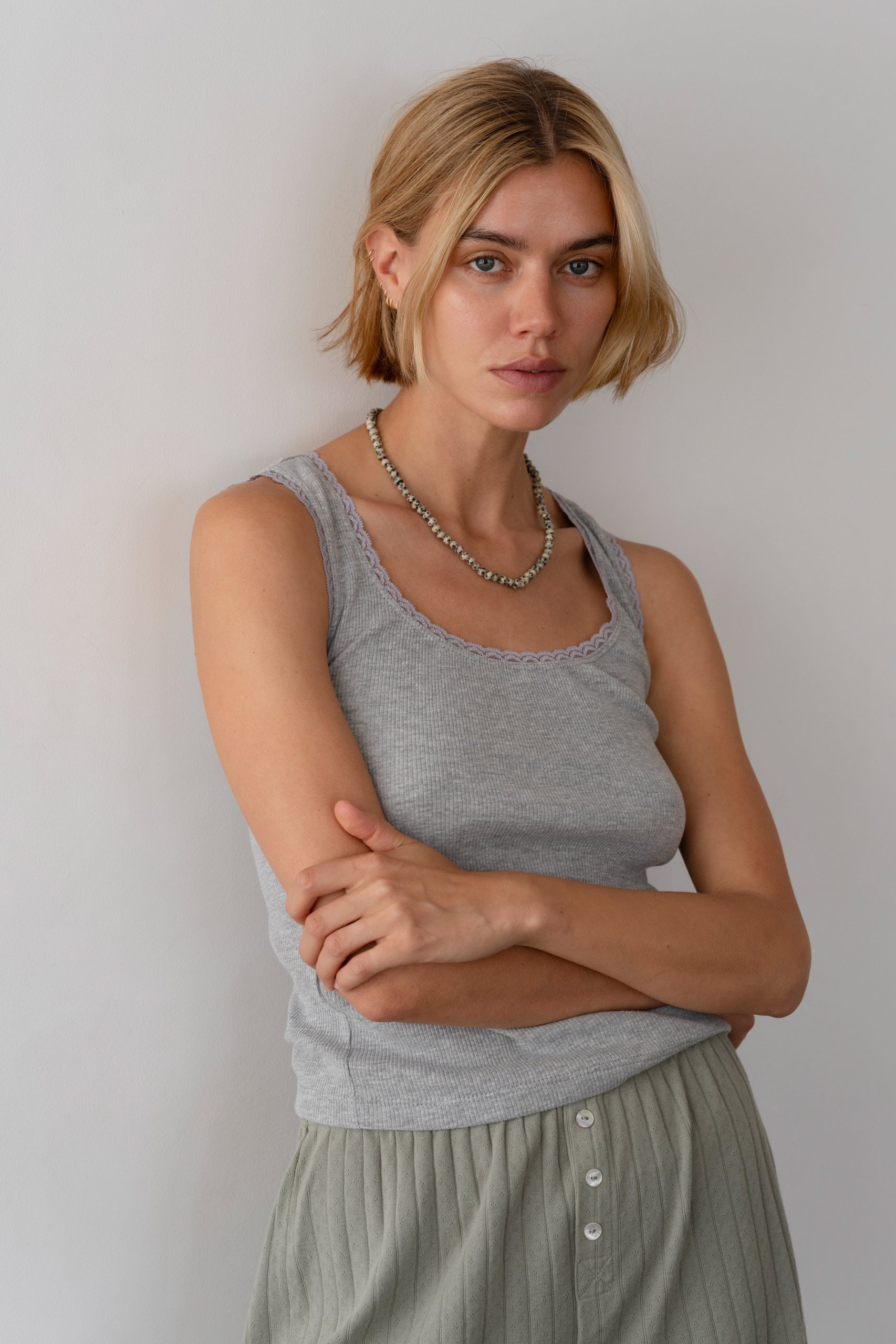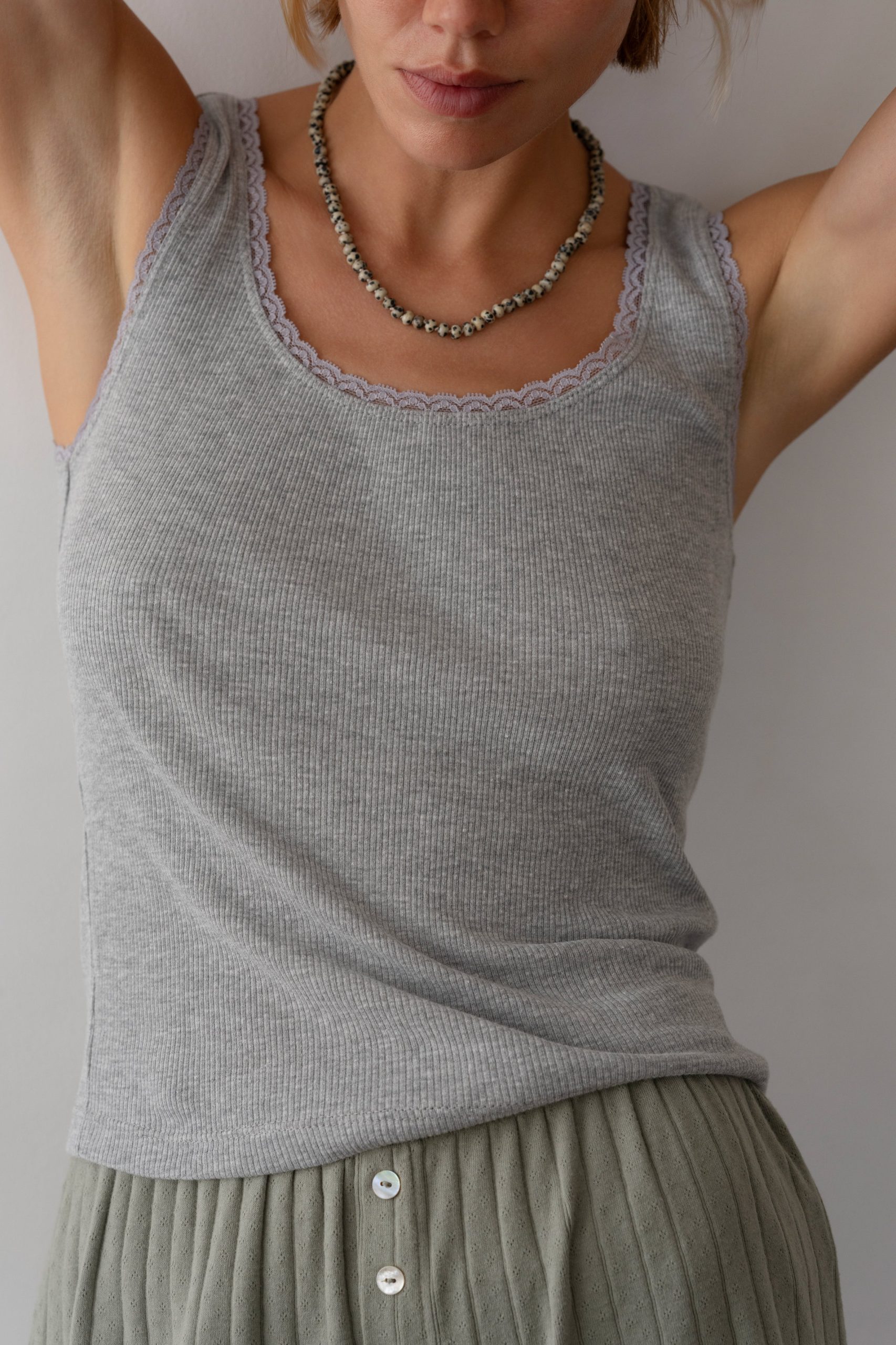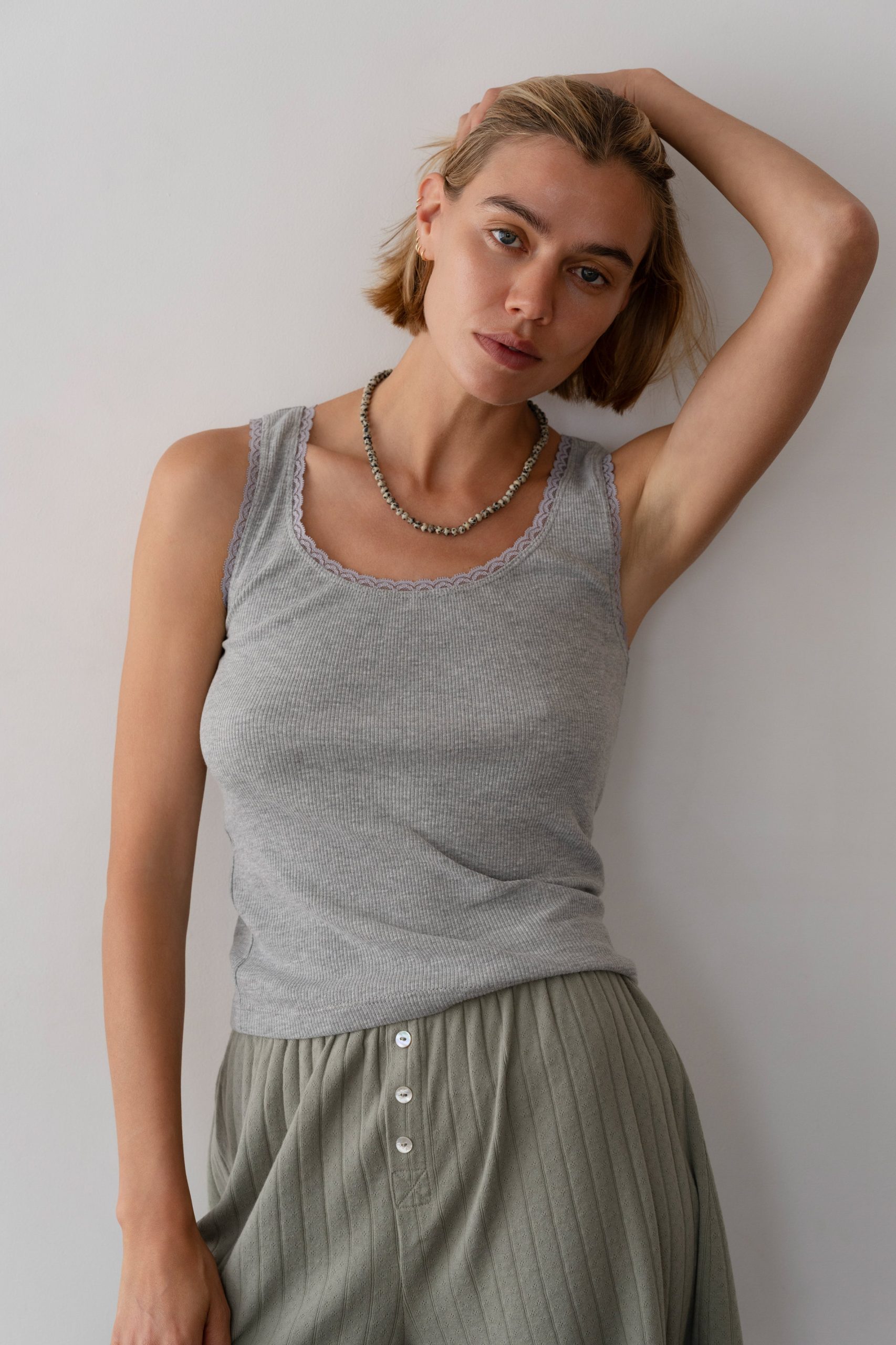 The Vintage Rib Lace Tank is crafted from 100% cotton and features ultrasoft micro ribbing, lace-trimmed edges, and a true-to-size fit for easy everyday wear.